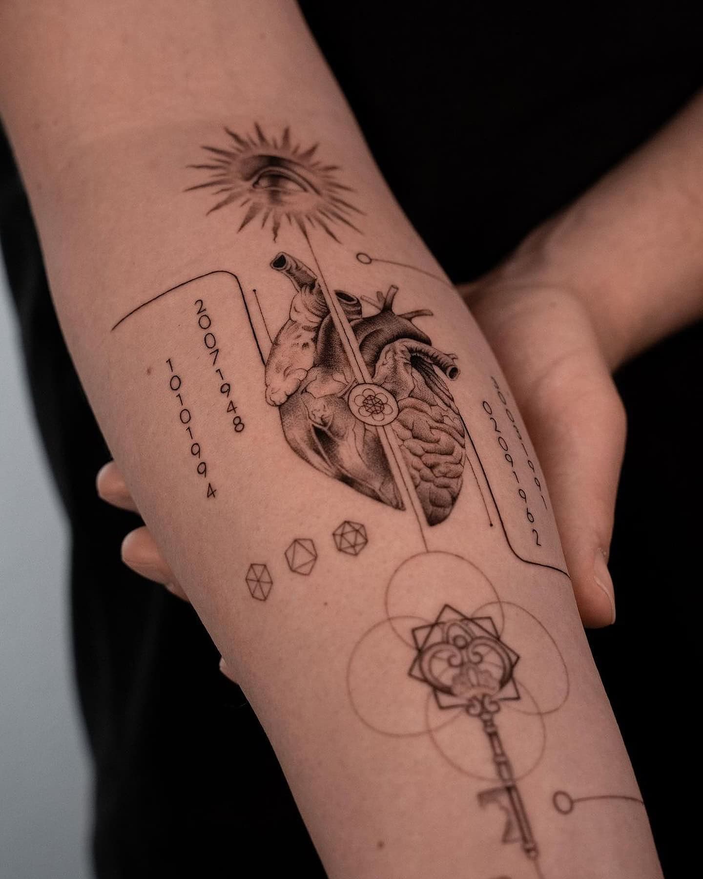 I am obsessed with this design! This tattoo stands out with its striking blend of a detailed heart and a mystical eye, creating such a powerful visual story. The combination of organic and geometric shapes adds a lot of depth, making it a definite conversation starter.