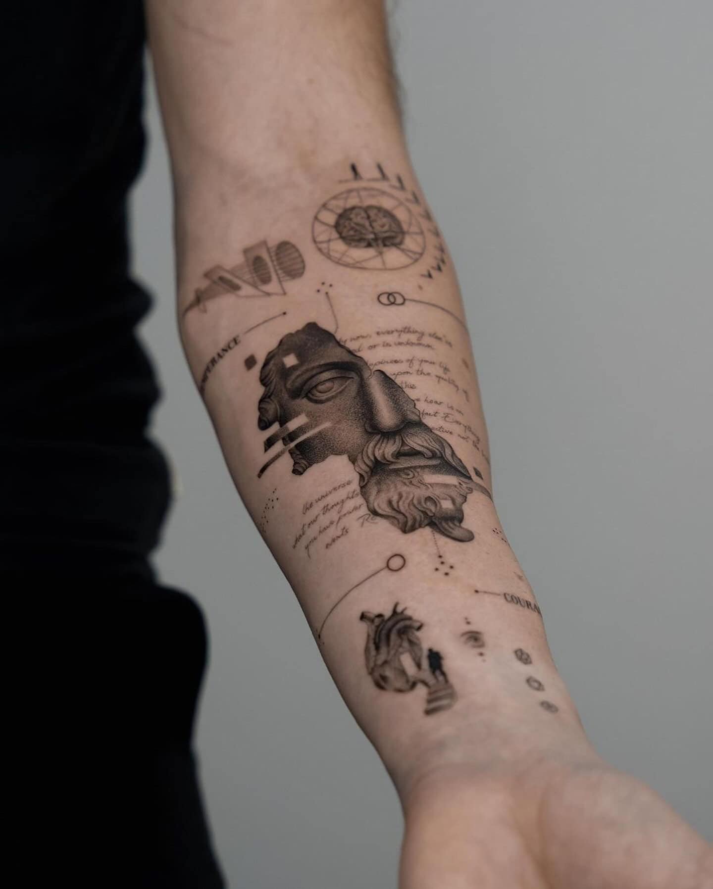 I think this tattoo is just exquisite with its intricate design. It features a majestic figure surrounded by celestial elements and symbolic imagery. Each detail, from the detailed face to the geometric shapes, tells a story of exploration and discovery.