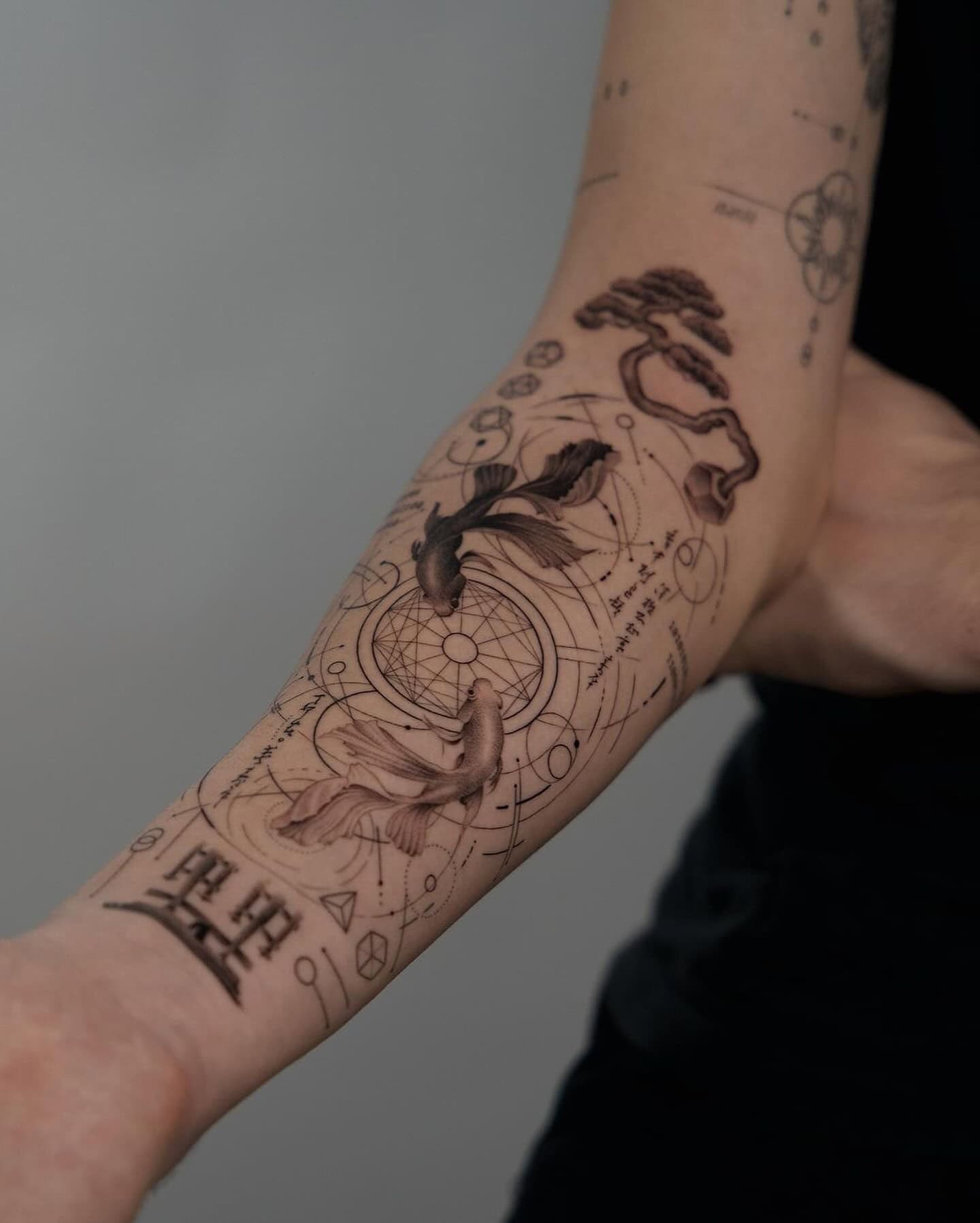 I love how this design beautifully blends the elegance of koi fish with intricate cosmic patterns. The swirling lines and geometric shapes create a mesmerizing effect, turning the arm into a canvas of art and symbolism.