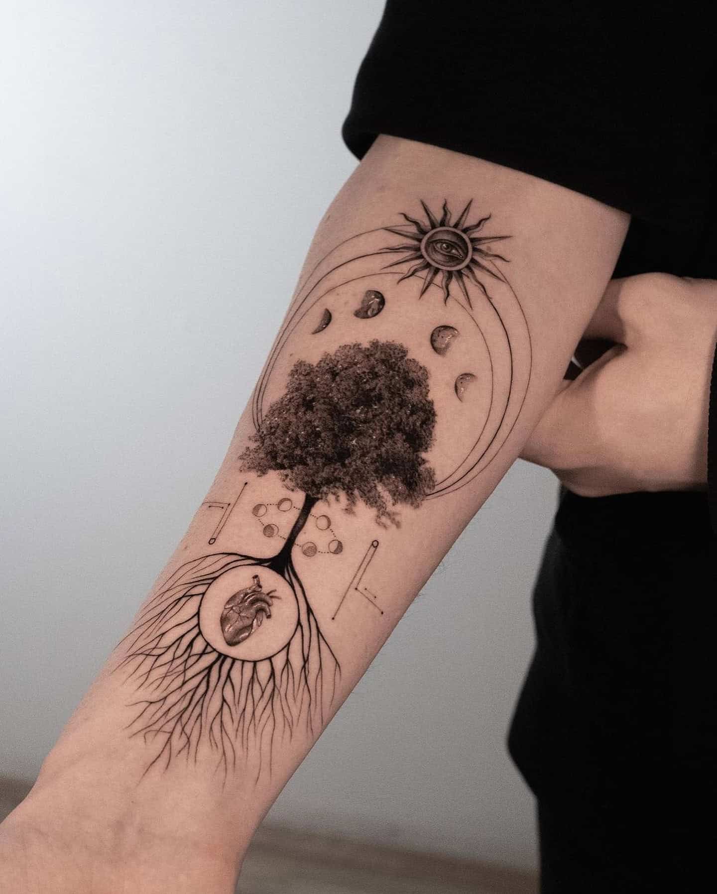 This one has such a striking blend of nature and cosmic elements, featuring a tree intertwined with celestial symbols. The design is a beautiful representation of growth and connection, making it a perfect choice for those who appreciate both the earth and the universe.
