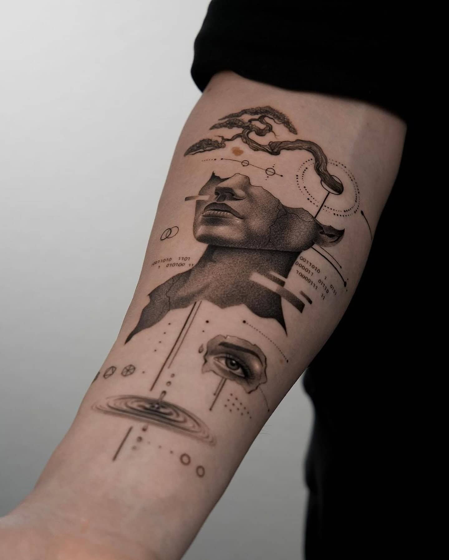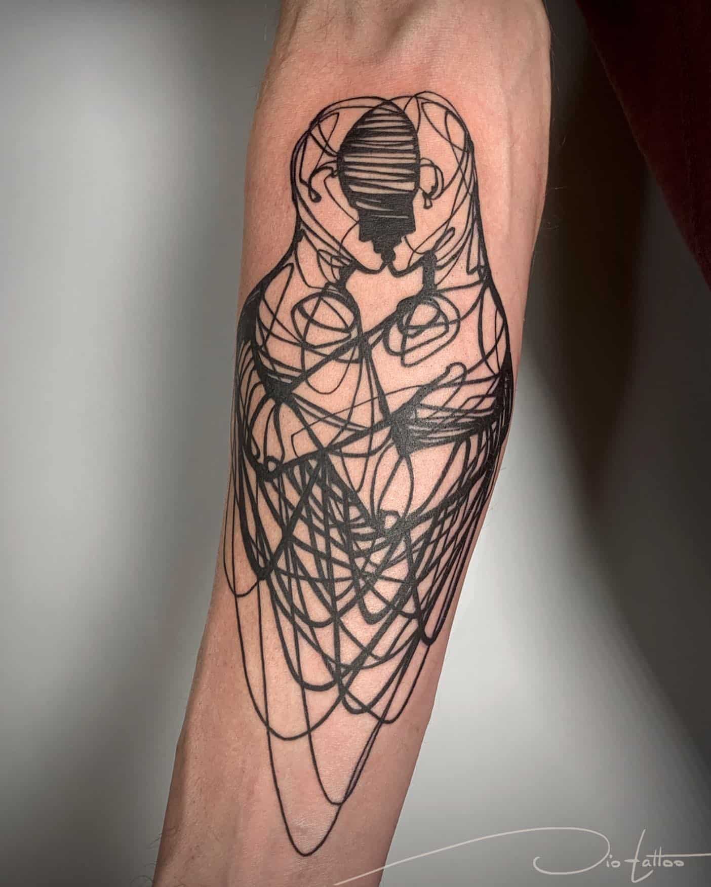 I love how this tattoo stands out with its intricate, swirling lines that create a unique visual story. The design captures a blend of abstract forms and shapes, and it really showcases an innovative approach to body art.