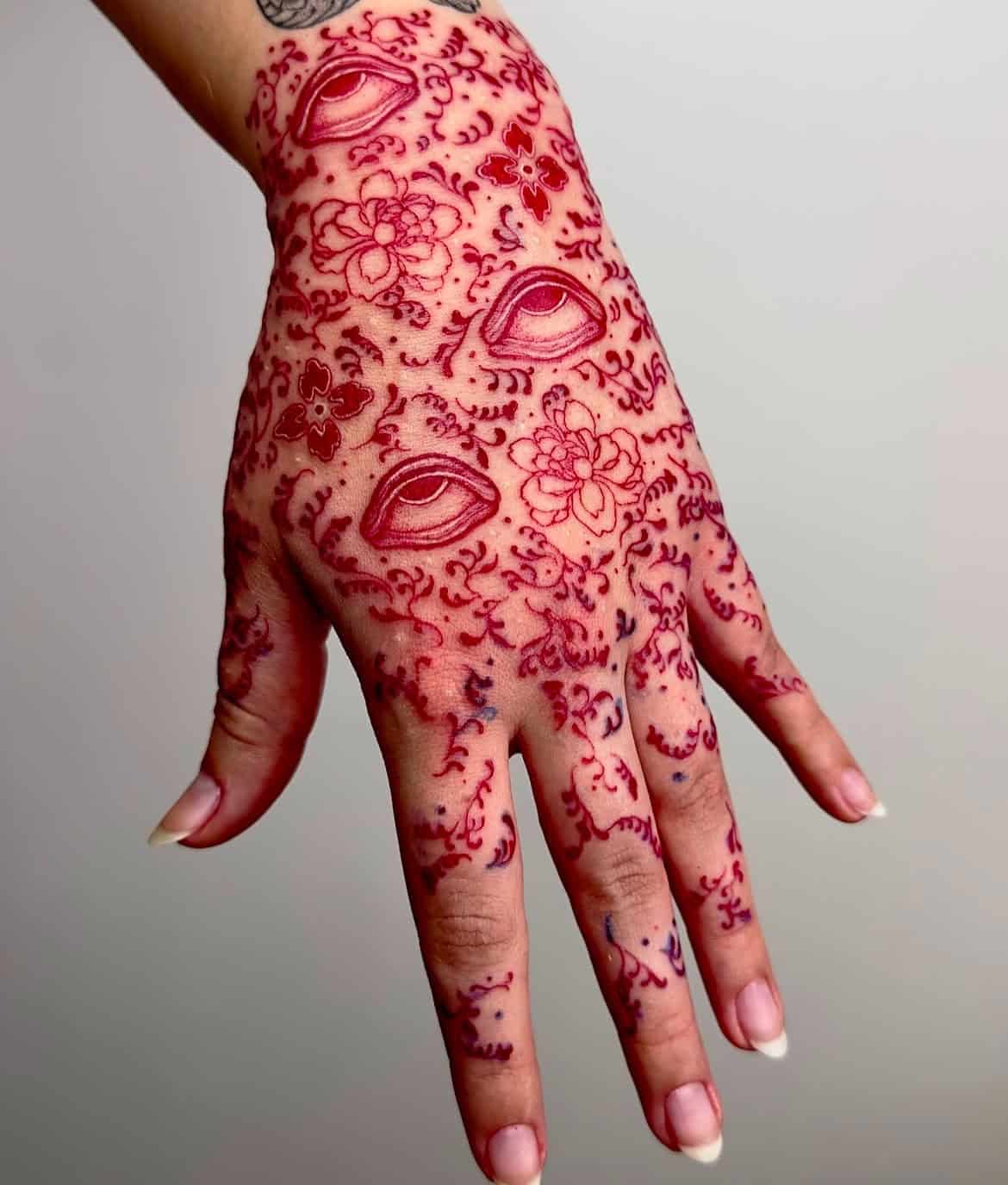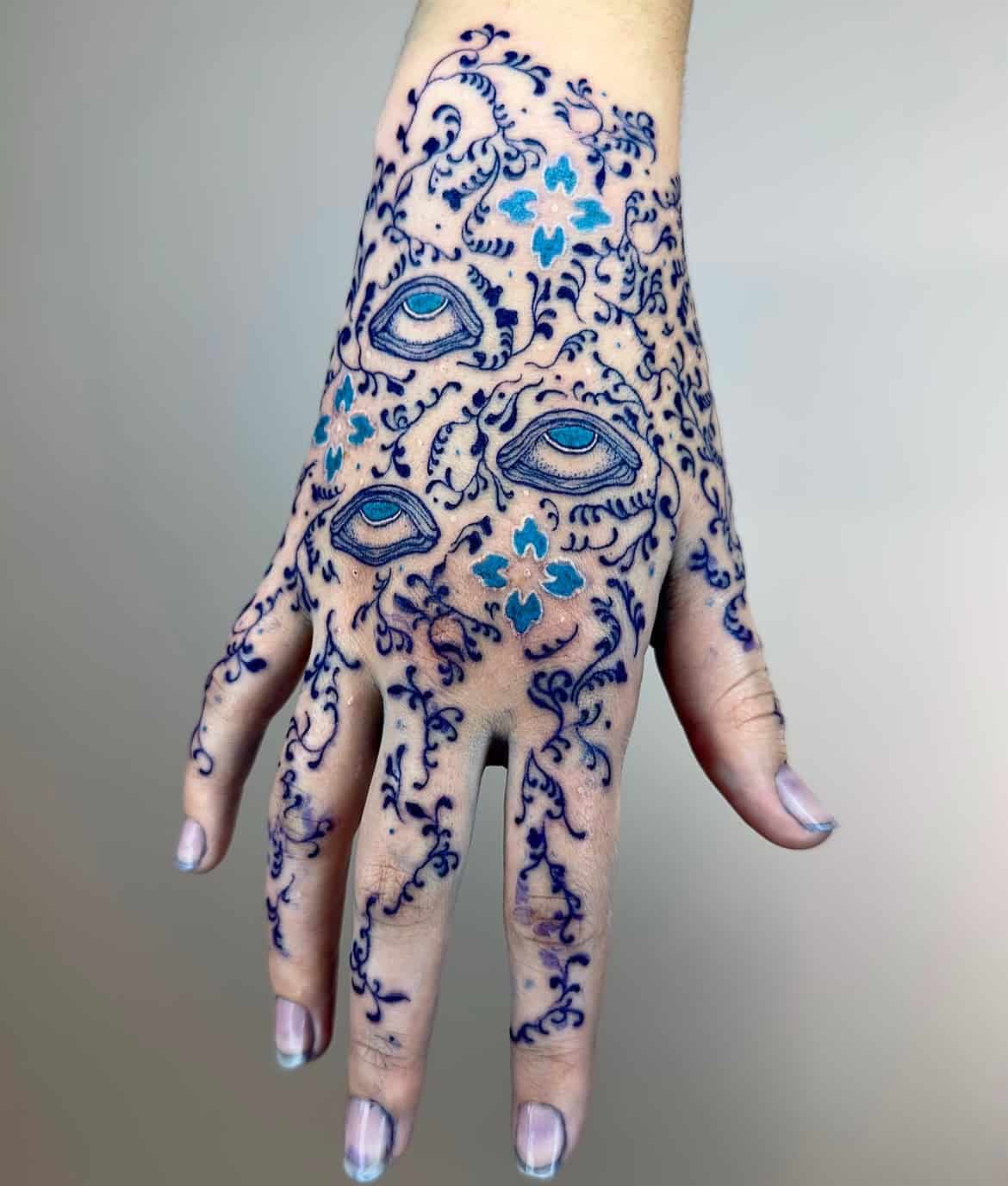 This stunning hand tattoo features intricate designs with blue eyes peering out from a beautiful floral pattern. The combination of delicate lines and vibrant colors creates a mesmerizing effect that really draws attention.