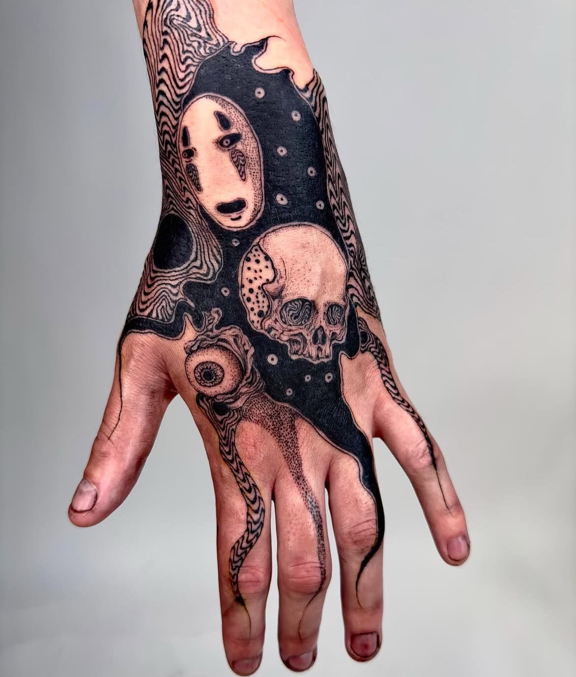 I’m a big fan of this tattoo! It showcases a blend of mystical creatures and intriguing symbols that just seem to dance across the hand. With elements like a ghostly figure and a skull intertwined, it tells a story with both whimsy and depth.