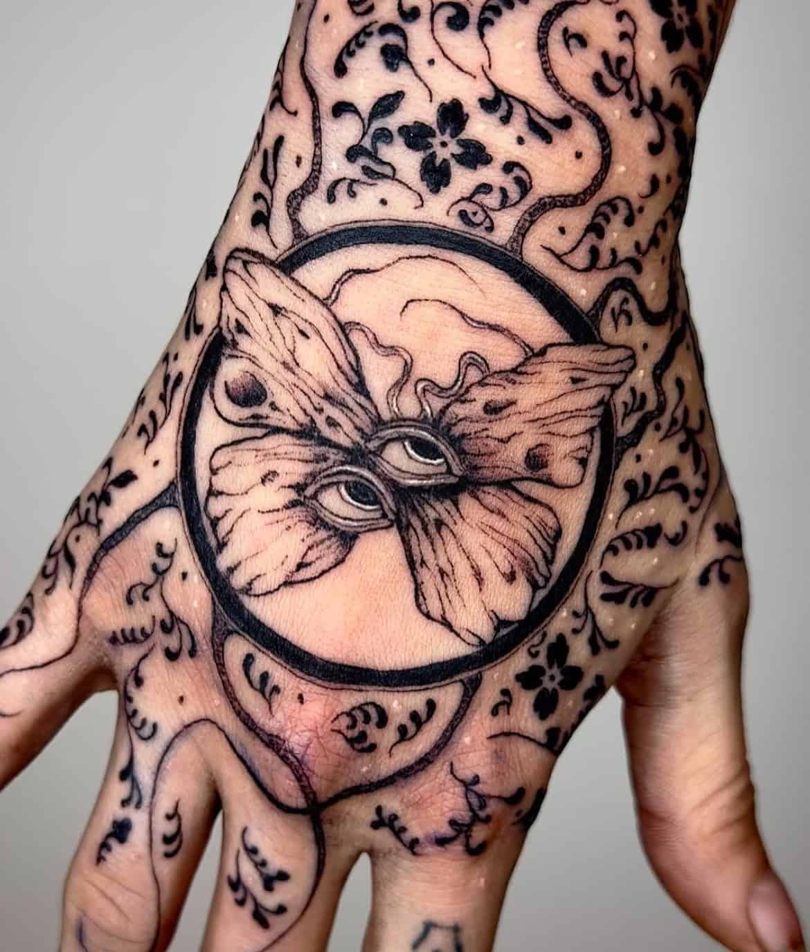 This hand tattoo is so enchanting with its captivating butterfly design. I mean, it features striking eyes that draw your attention right in. The intricate floral patterns around the butterfly add a touch of elegance, making it a true work of art.