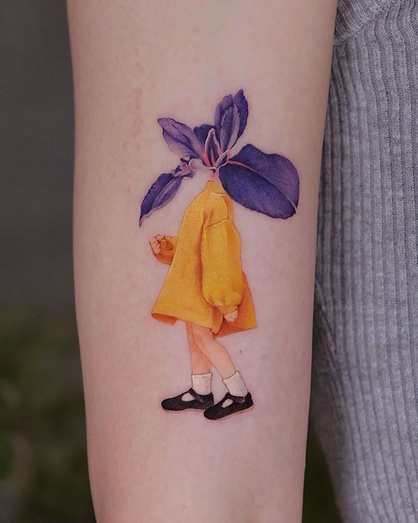 I love everything about this whimsical design! It features a headless girl in a bright yellow dress, with vibrant purple leaves sprouting from her neck. It combines the innocence of childhood with elements of nature so beautifully, creating a striking visual that definitely tells a story.