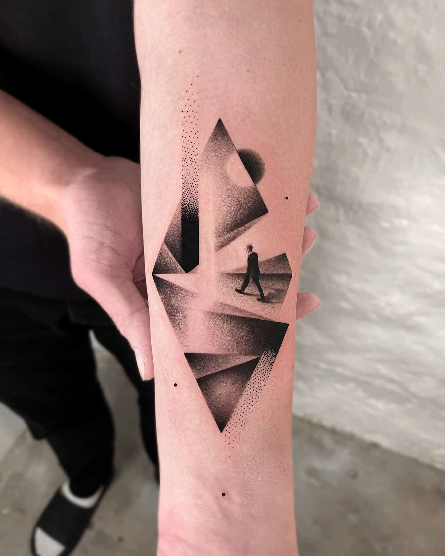 This tattoo has such a striking design of geometric shapes that create the illusion of a walking figure exploring an abstract landscape. The blend of sharp angles and soft shading really draws the eye, making it an enchanting piece of body art.
