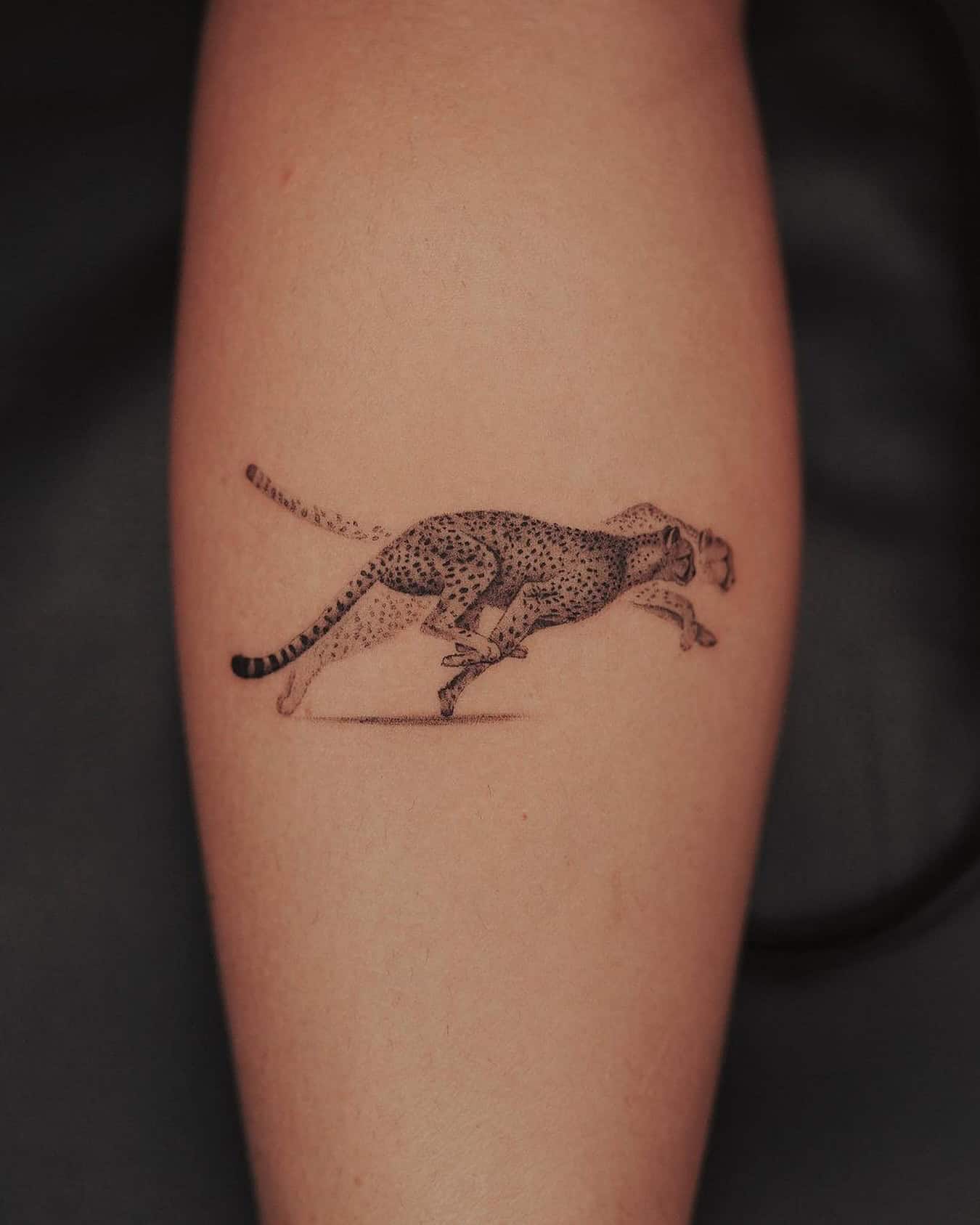 Wow, this tattoo is so elegant! It beautifully captures a cheetah sprinting, showcasing incredible detail and a sense of speed. The artist’s skilled use of shading really brings the animal to life, making it feel like it’s about to leap right off the skin.