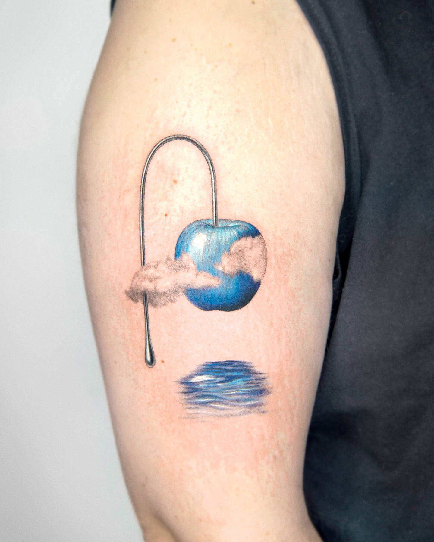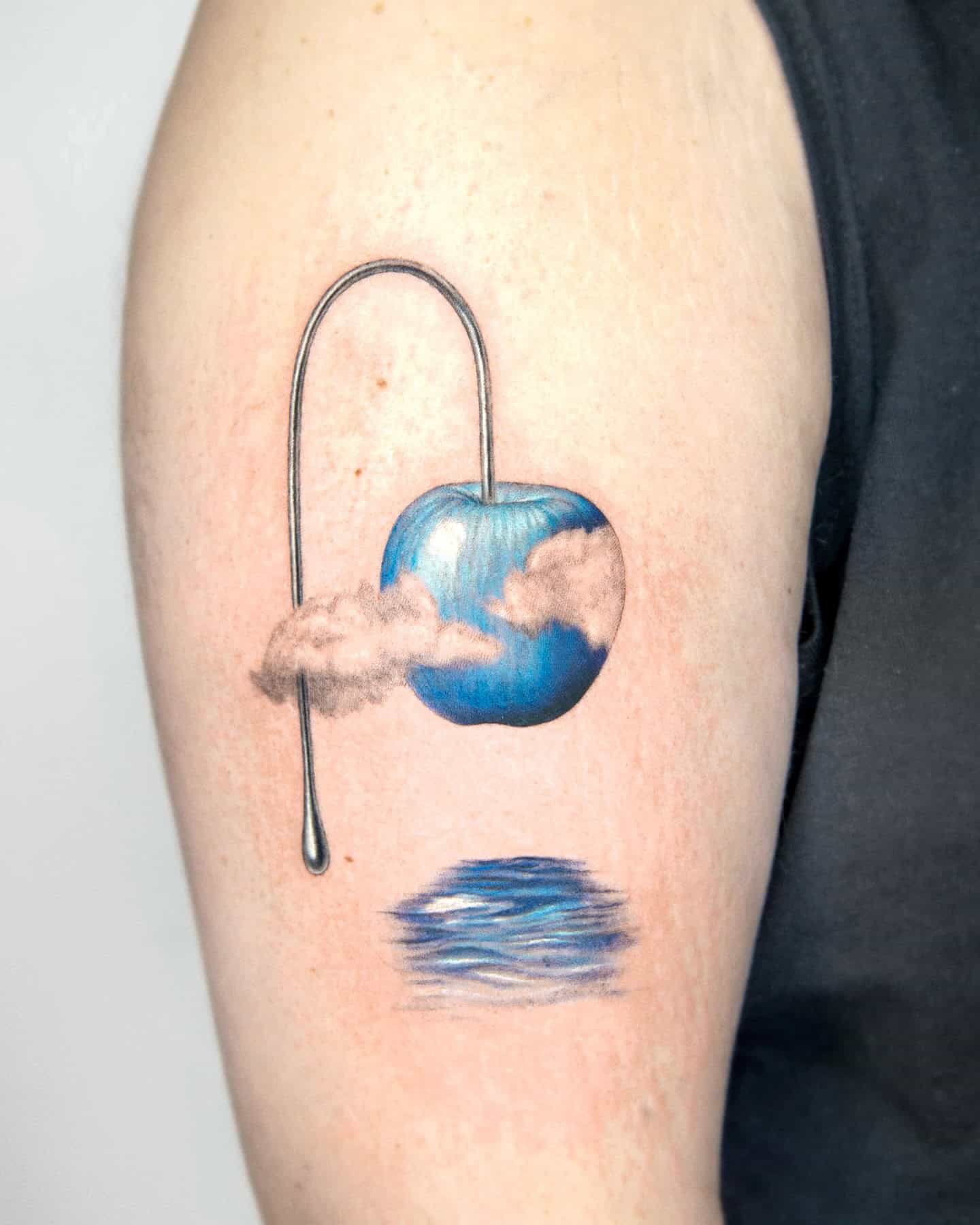 This tattoo is seriously mesmerizing. It features a blue apple suspended in the sky, complete with fluffy clouds and a shimmering water reflection below. The imaginative design invites you to ponder its meaning, blending elements of nature with creativity.
