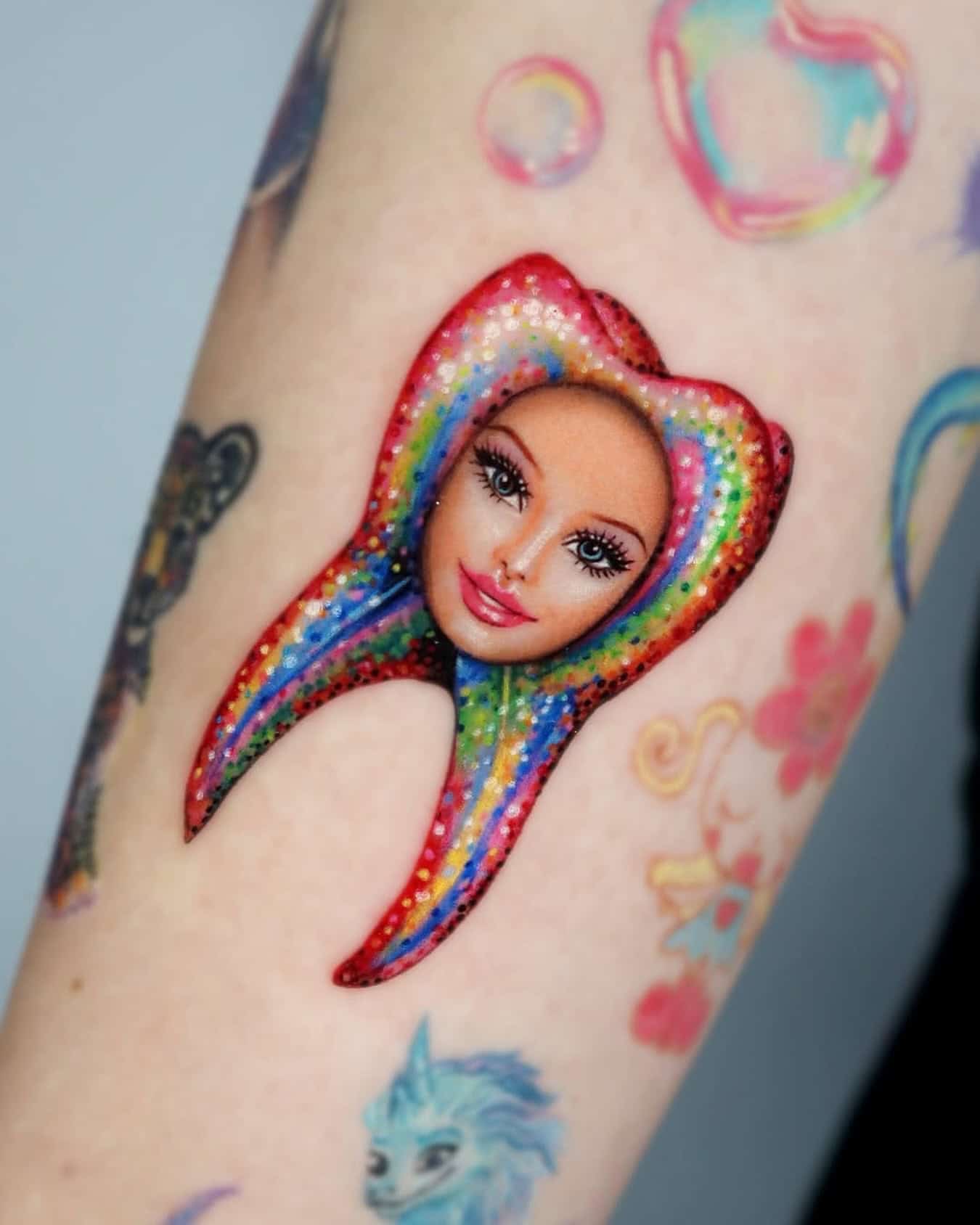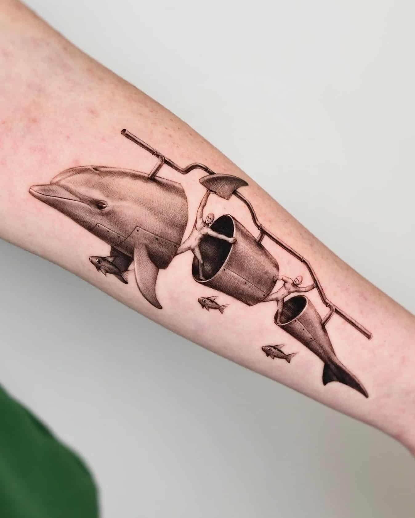 This tattoo features a playful dolphin with a unique twist. It’s depicted alongside a whimsical scene of a tiny person riding in a makeshift pod. I just love how the design captures a sense of adventure and imagination, making it truly one of a kind.