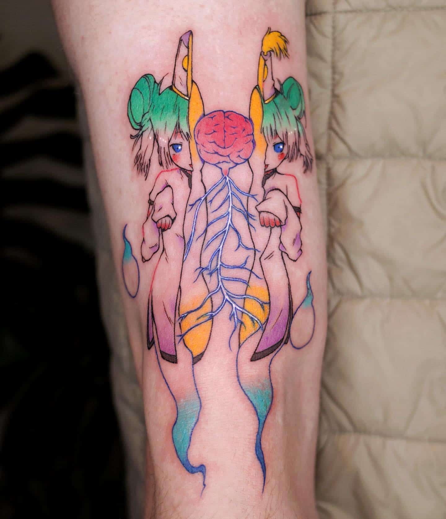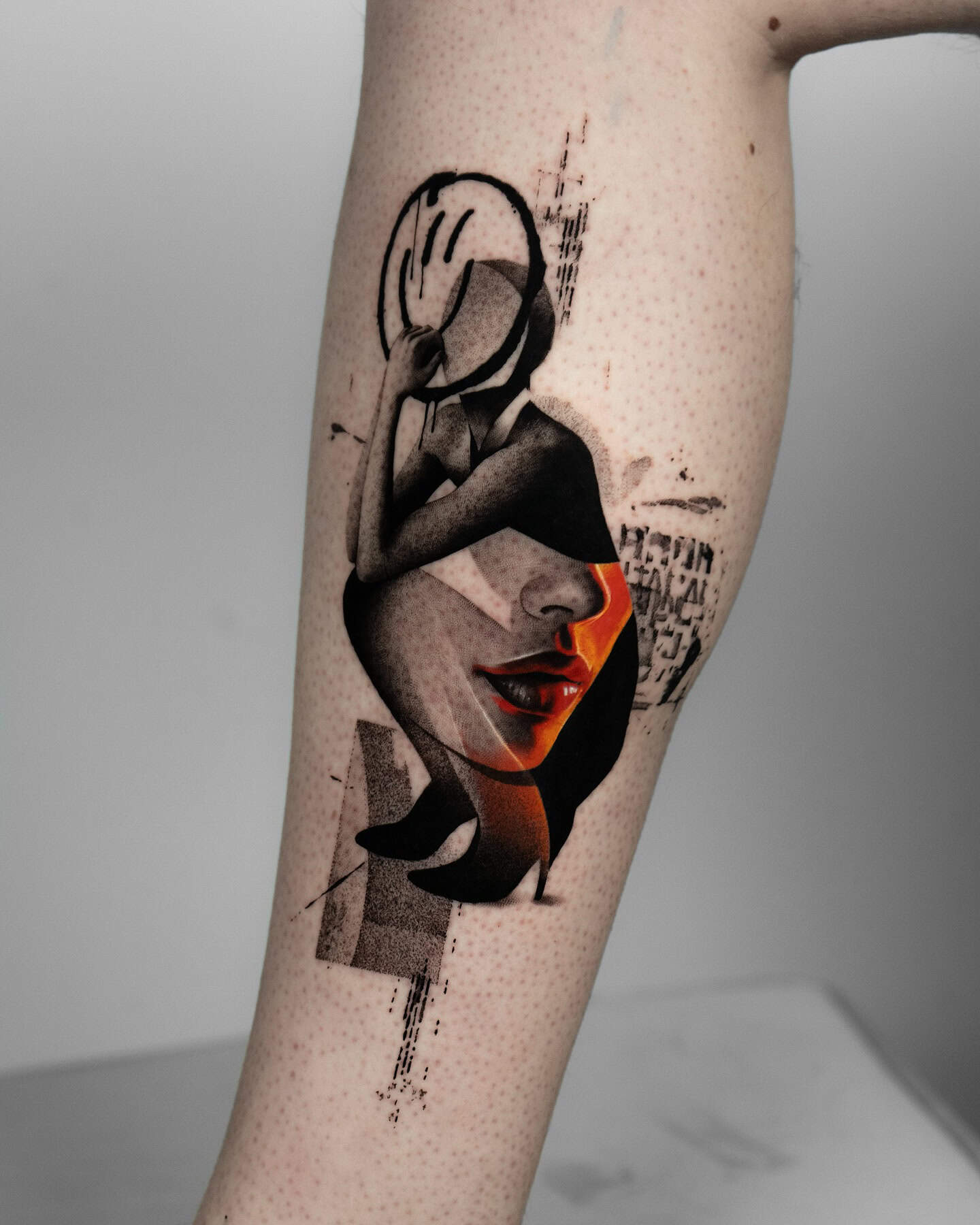 This tattoo showcases a stunning blend of shapes and colors, creating a unique portrayal of a figure with an interesting twist. I love how the use of contrasting elements, like the playful smiley face and the elegant woman’s silhouette, invites you to interpret the art in your own way.