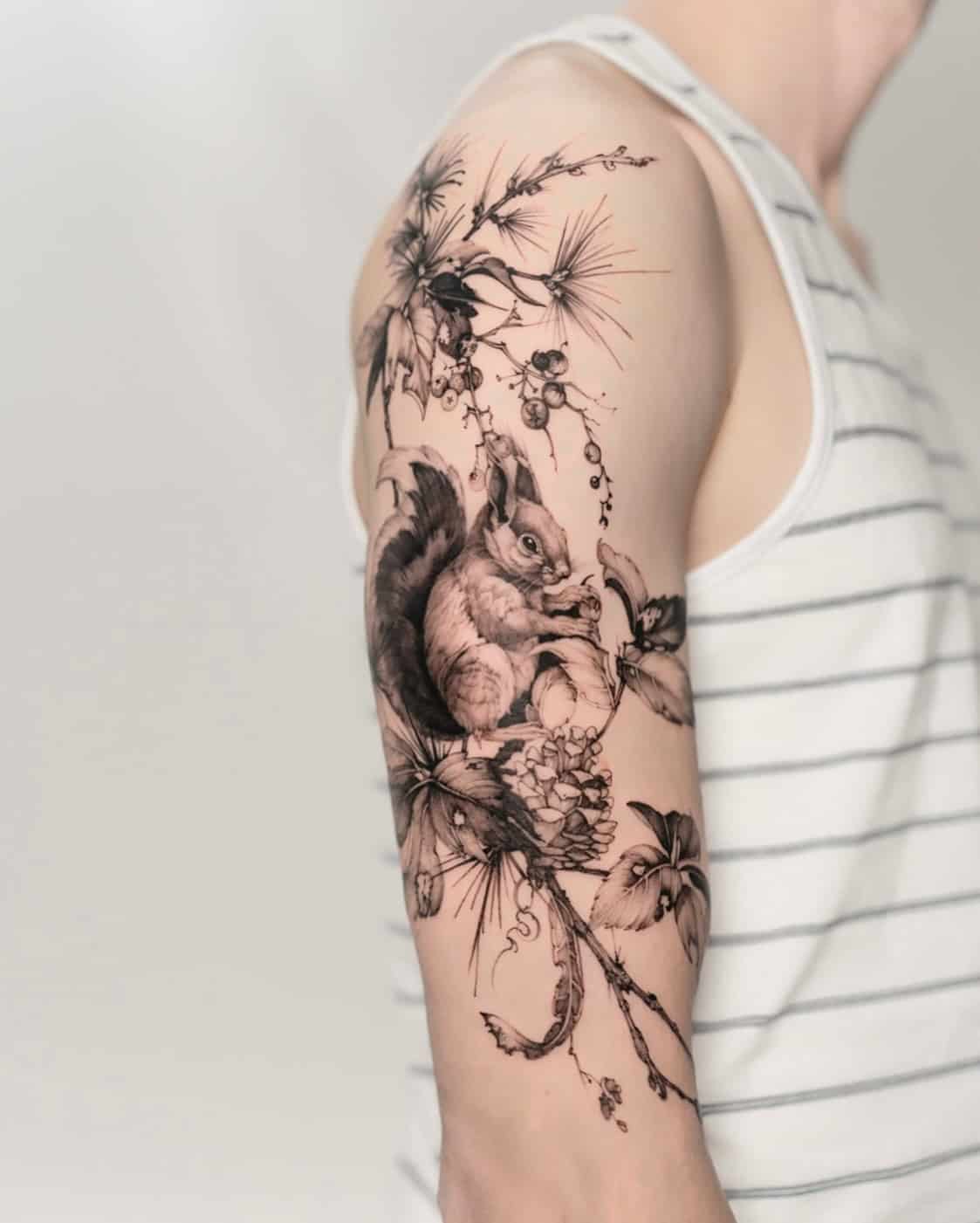 This is such a lively scene. The tattoo beautifully combines a playful squirrel with intricate floral designs on the arm. The detailed artwork captures the essence of nature, making it a great conversation starter.