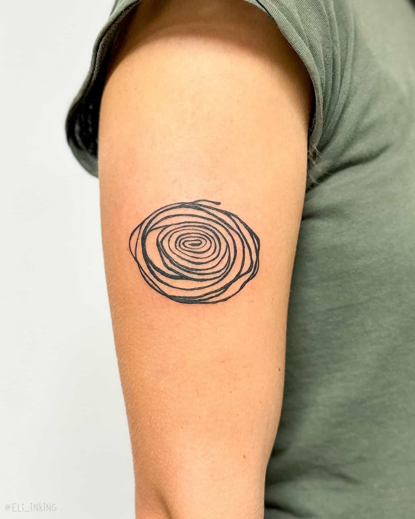 I think this tattoo is so captivating with its simple yet striking spiral that just draws you in. The flowing lines give it a sense of movement, and you could totally see it symbolizing a journey or personal growth.