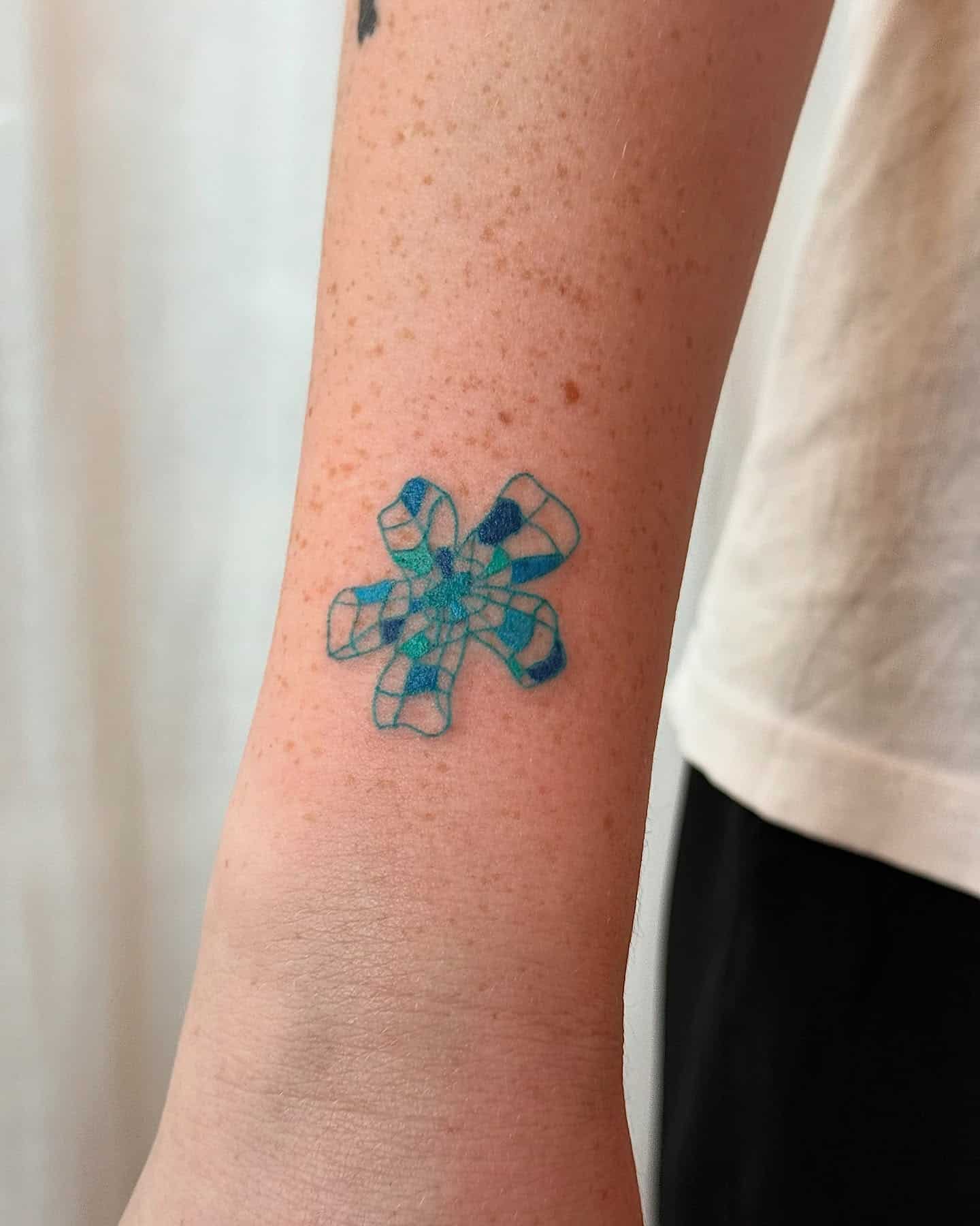 This tattoo totally stands out with its unique geometric flower design. It blends vibrant blues and greens in such a captivating way! The intricate patterns create a sense of movement, which makes it feel alive right on the skin.