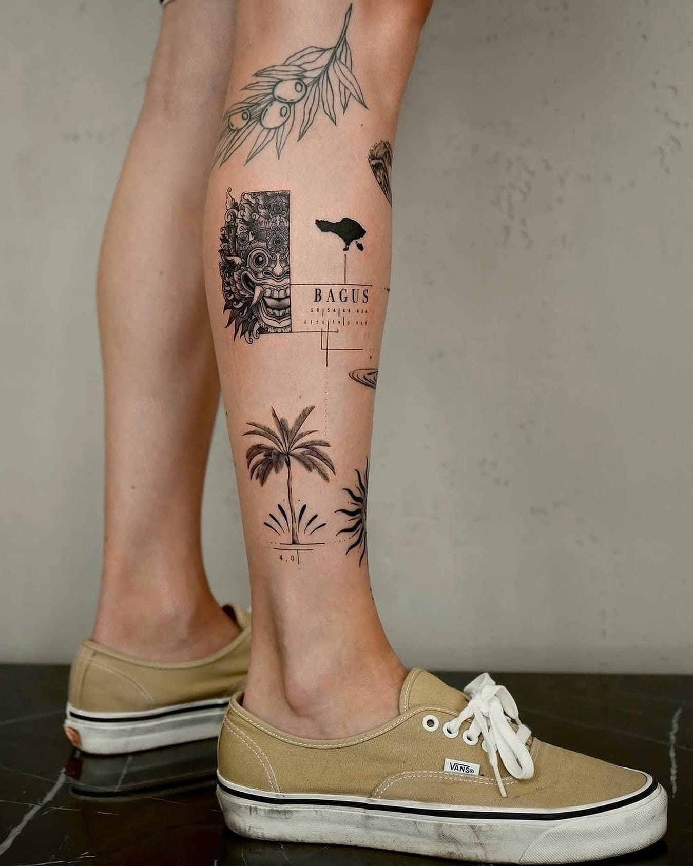 I love that this tattoo design stands out with its mix of detailed images and symbols, creating a vibrant story right on the skin. It features a unique blend of nature and culture, with art that showcases everything from palm trees to intricate masks, making it a true conversation piece.