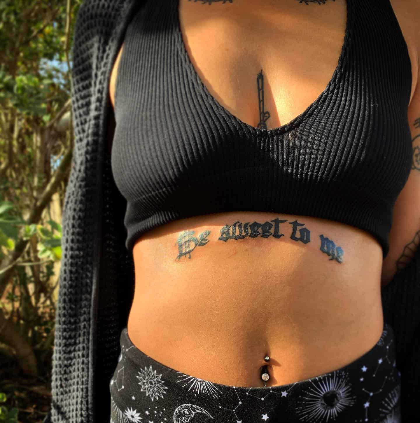 This stunning tattoo says it all with the phrase “Be sweet to me,” and I am obsessed. It’s beautifully inked across the upper stomach, and the elegant lettering creates such a warm, inviting vibe against the outdoor backdrop.