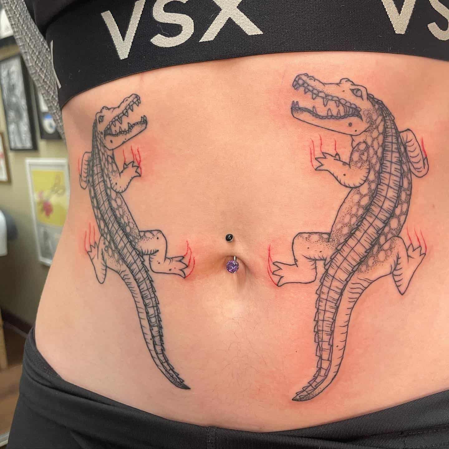 Okay, how fun is this one? This image showcases a pair of striking crocodile tattoos that practically leap off the skin with their vibrant details. The unique design, which has these cool fiery accents, adds such a playful and bold touch to the upper stomach area.