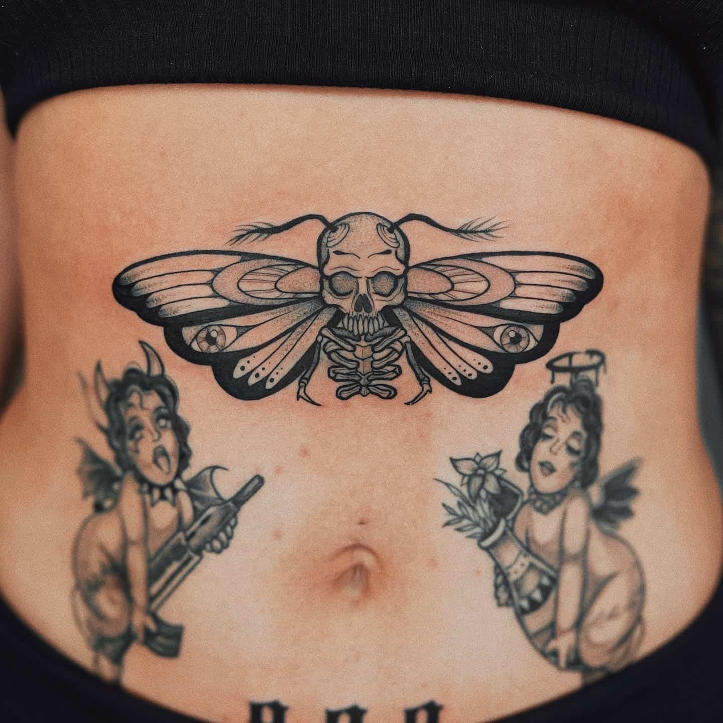 I love everything about this striking tattoo. It showcases a beautifully detailed moth with a skull, creating a powerful contrast that really draws you in. The angelic figures on the side add a whimsical little twist, which makes the whole piece feel both intriguing and thought provoking.