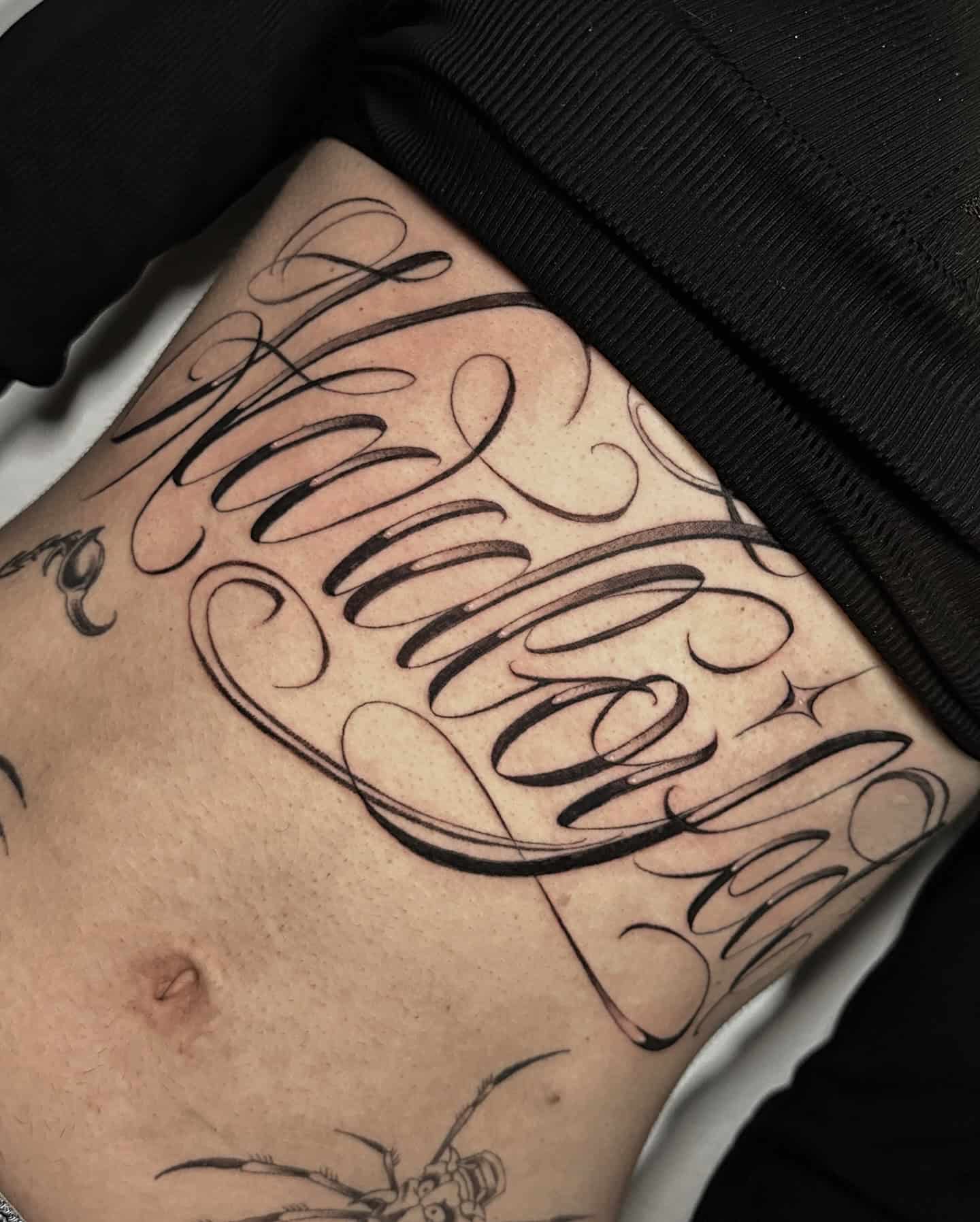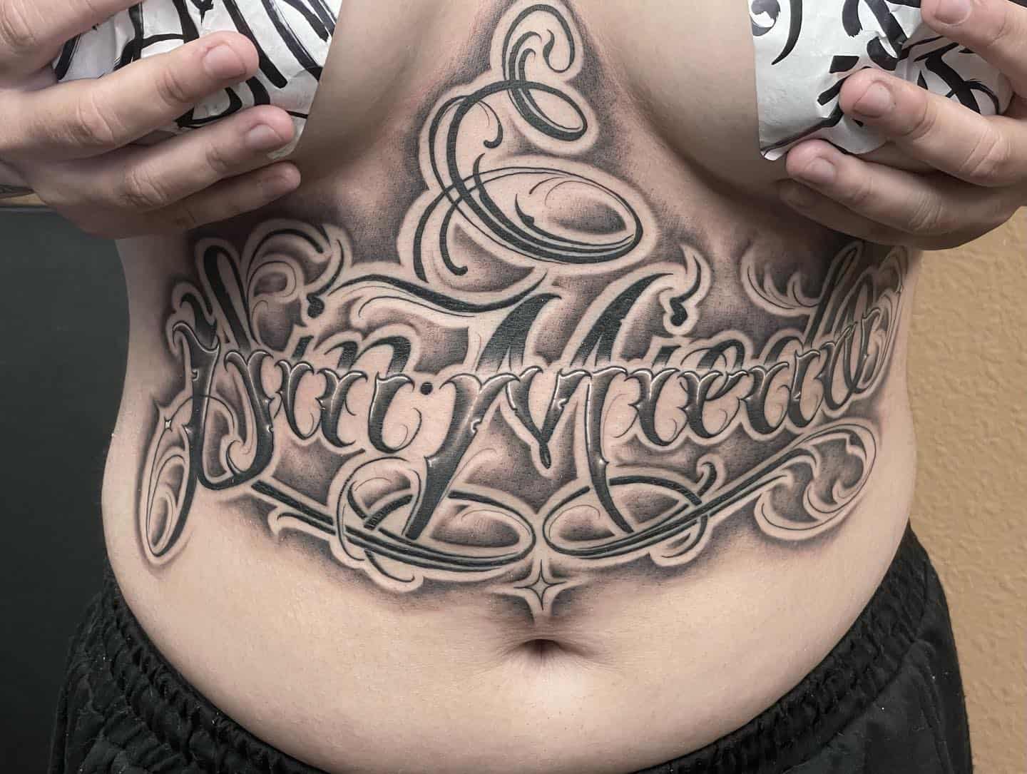 I am a big fan of a beautifully crafted script tattoo. This one features elegant lettering that flows so gracefully across the upper stomach. The intricate design really highlights a personal meaning, making it a standout piece that tells its own unique story.