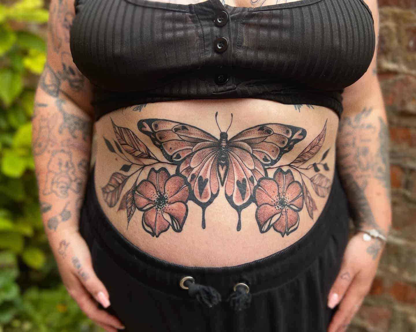 You can never go wrong with a butterfly tattoo. This stunning upper stomach piece features a beautiful butterfly surrounded by delicate flowers, creating a truly eye-catching display of nature’s beauty.