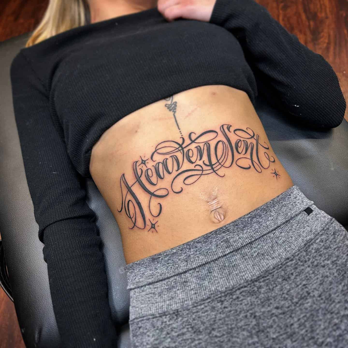 A phrase tattoo can be so powerful, and this one is just beautiful. It features “Heaven Sent” written in this gorgeous, flowing script right across the upper stomach. The delicate design paired with those subtle little stars gives the whole look so much charm and elegance.