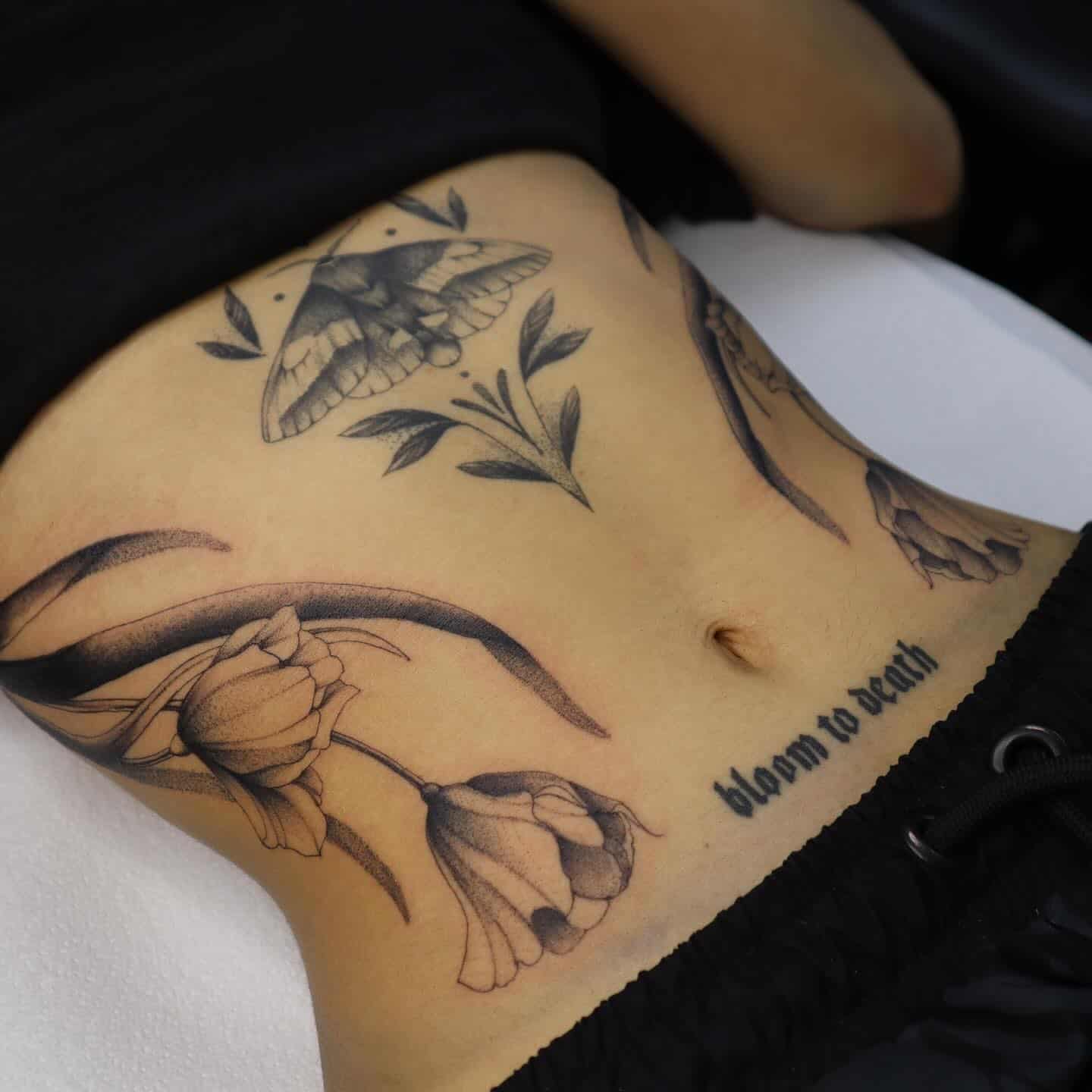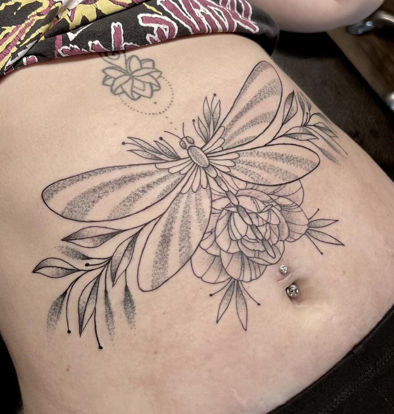 This tattoo is such a dream. It features a beautiful arrangement of flowers and a butterfly, creating a vibrant story right on the skin. The intricate details of the petals and the delicate little moth bring a sense of life and movement to the upper stomach.