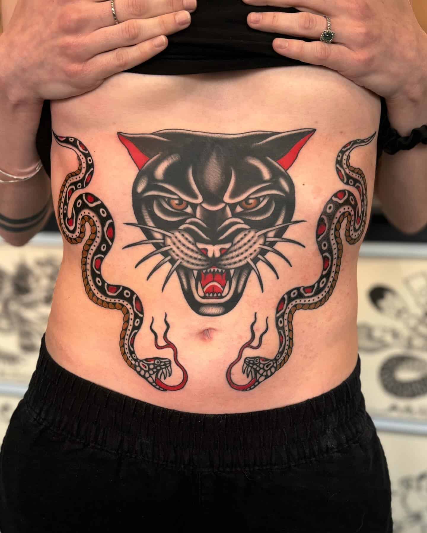 If you’re looking for an edgier vibe, bookmark this one. This striking tattoo has a fierce panther face flanked by slithering snakes, which adds such a cool flair. The bold colors and intricate details create a captivating story of strength and mystery.