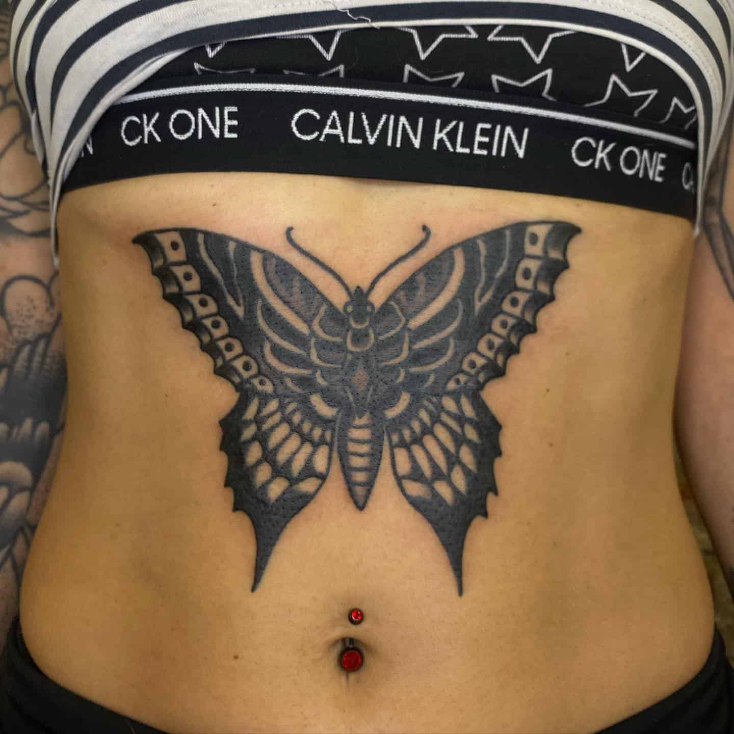 I’m seriously crushing on this stunning butterfly tattoo. The way it’s placed on the upper stomach is just perfect. I love that the intricate details and bold lines make the design totally pop. Butterflies are such a powerful symbol of transformation and freedom, so this piece makes a real statement.