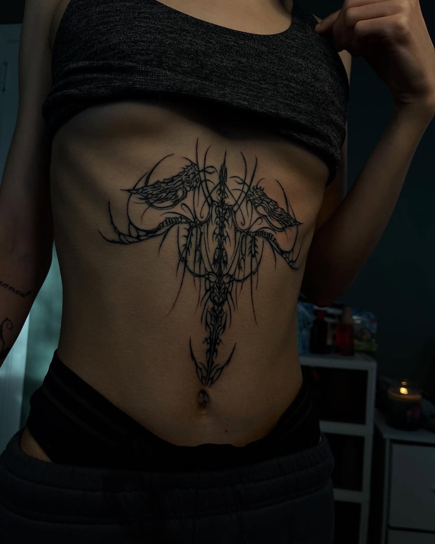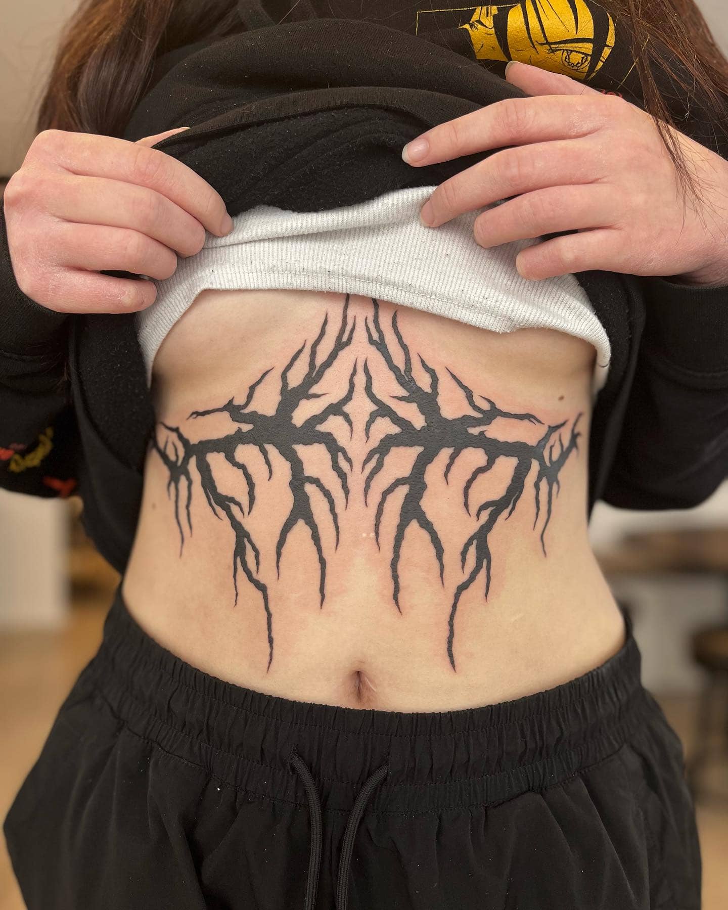 Talk about a bold look. This striking upper stomach tattoo showcases a lightning like pattern that grabs your eye right away. With its sharp lines and contrasting black ink, it creates a dynamic look that gives off both edgy and artistic vibes.