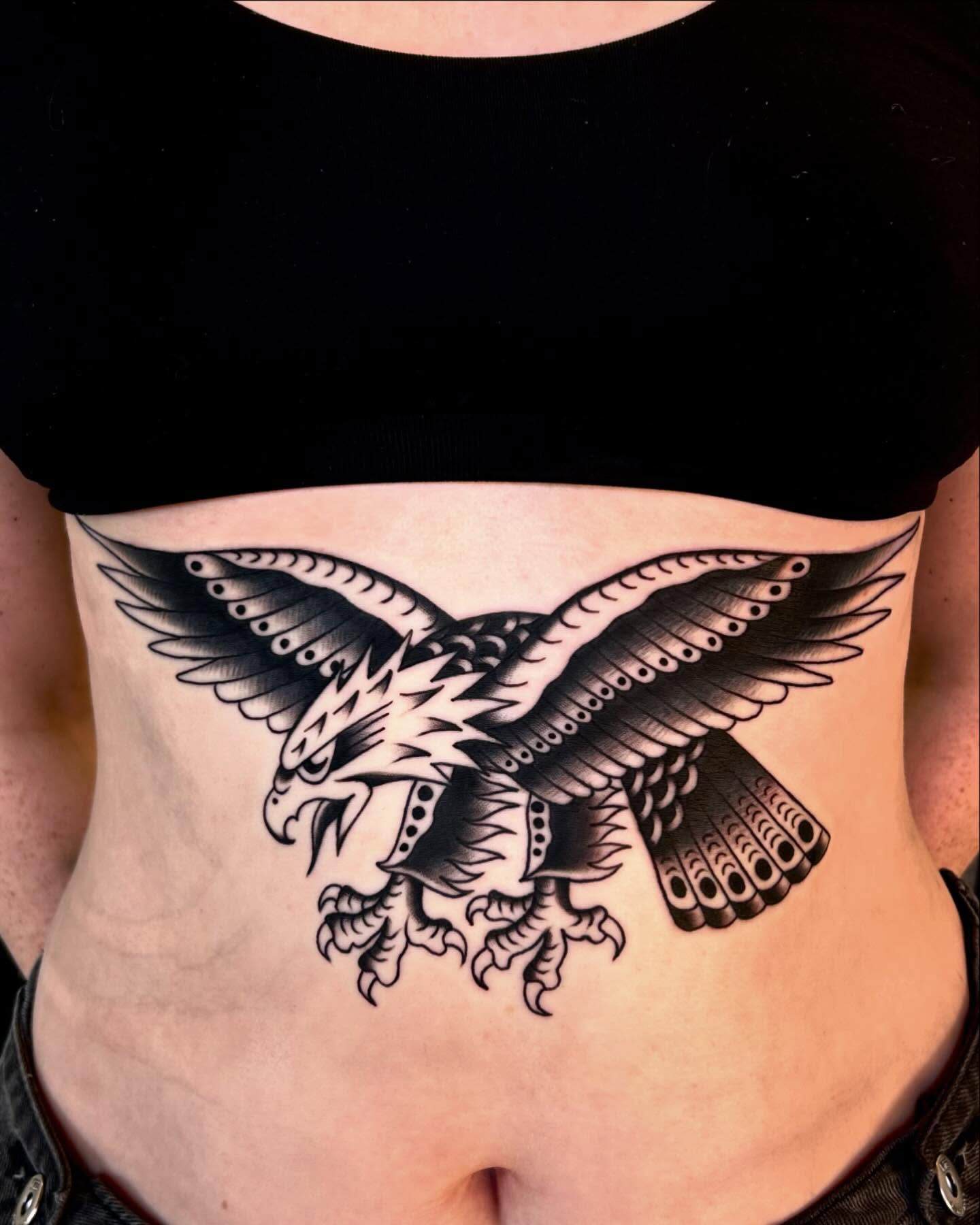 This eagle tattoo is such a showstopper. The way it soars across the upper stomach is so eye-catching, thanks to all the intricate details and its bold design. I love that the graceful wings and fierce expression bring major freedom and strength vibes, making it a super powerful choice for body art.