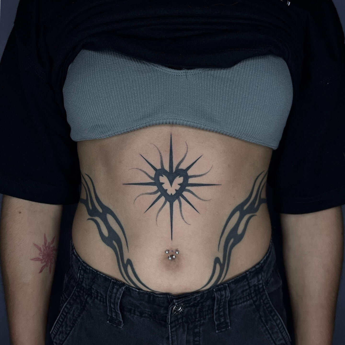 You can never have too much heart. This image shows a stunning upper stomach tattoo with a heart at the center, surrounded by intricate rays of light. The bold black lines create such a striking contrast against the skin, making the whole design truly eye-catching.