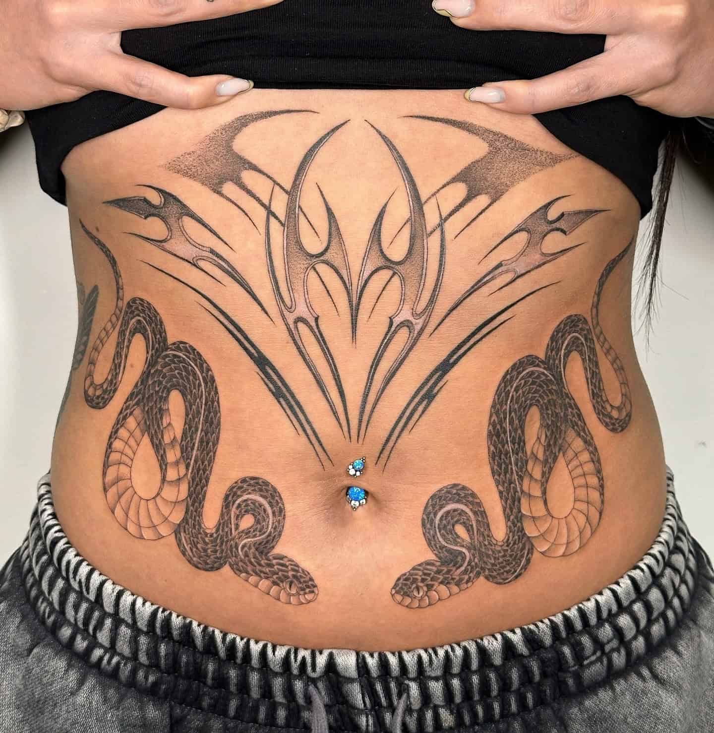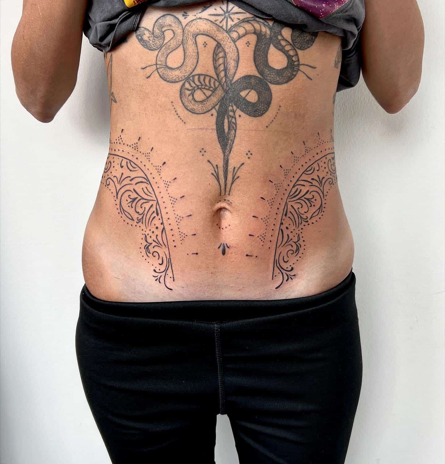 This tattoo is such a standout. I love the beautiful blend of intricate designs and bold shapes that immediately draw your eye. The delicate patterns on either side of the belly button create a striking visual balance with the snake design above it, adding so much depth and personality.