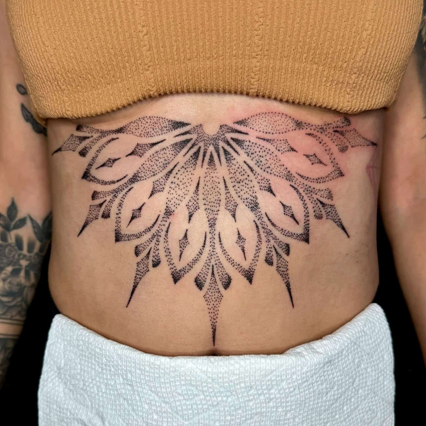 This stunning upper stomach tattoo is a true work of art. It showcases this beautiful blend of intricate designs and delicate patterns that I just can’t get enough of. The mix of floral motifs and sharp lines makes for a captivating visual effect that really draws the eye.