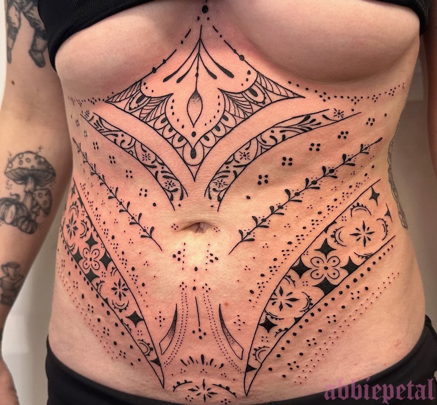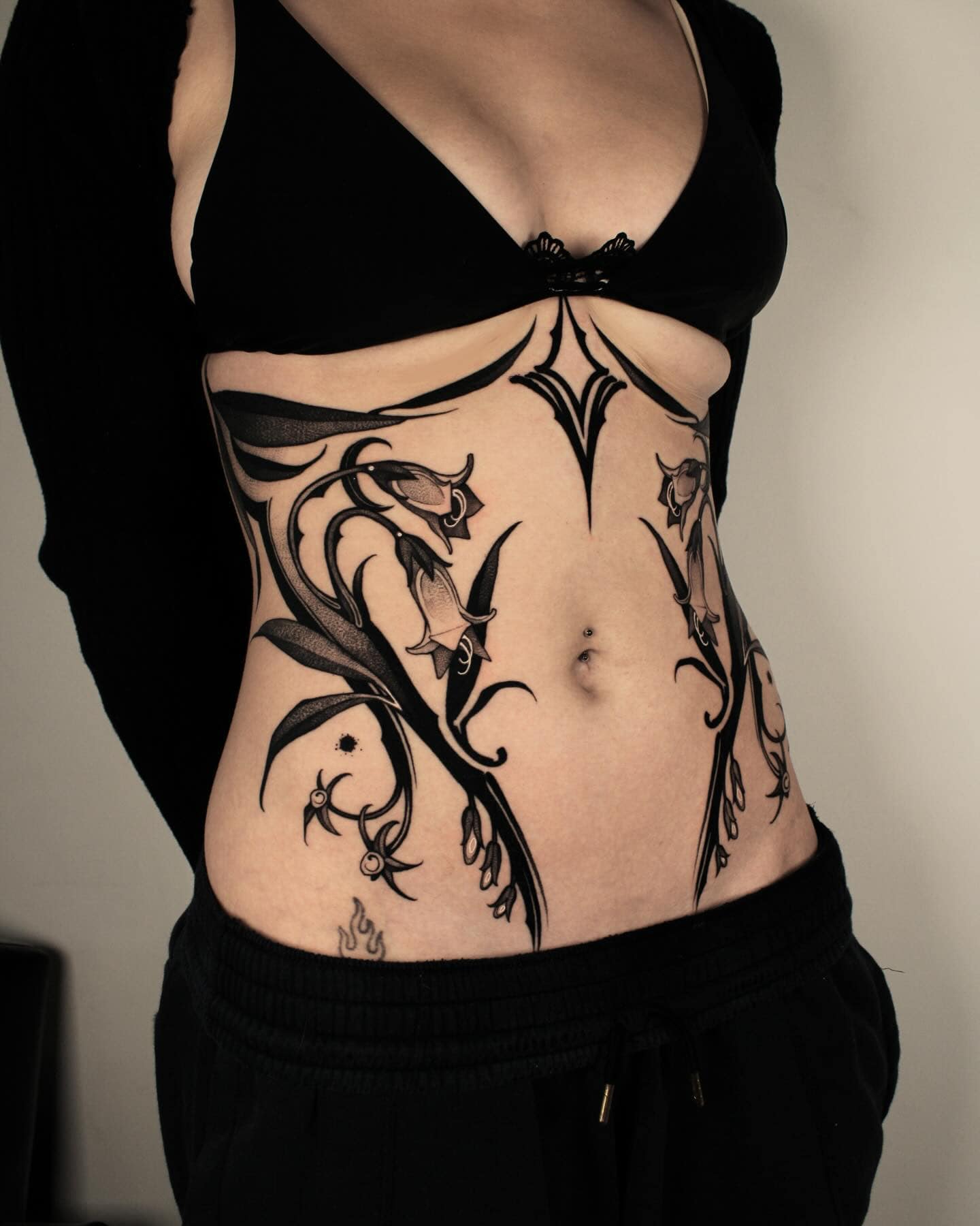 The flow of this tattoo is simply beautiful. This image highlights a beautifully intricate piece that moves so elegantly across the upper stomach. The use of bold lines and swirling designs creates this captivating visual that totally draws you in.