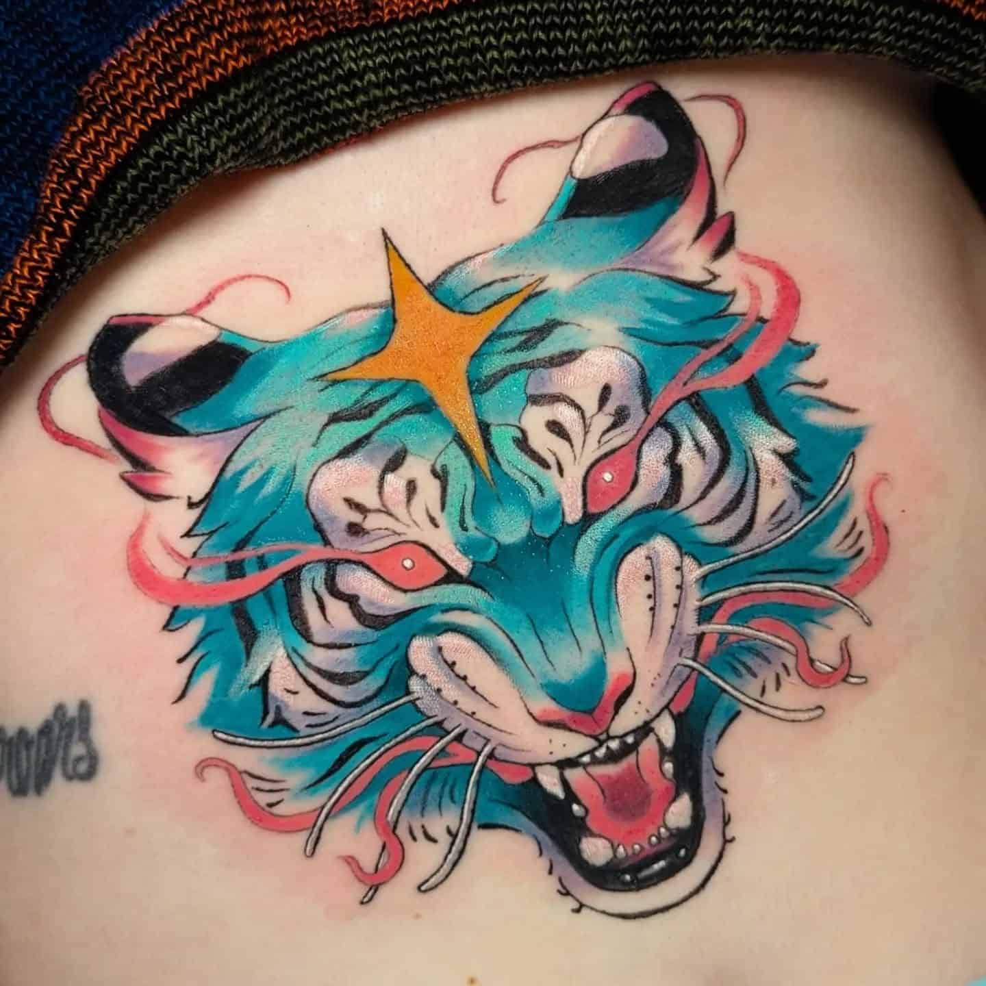 How cool is this tiger tattoo? The artist’s creative flair is on full display here, and I’m obsessed with the fierce expression. The vibrant blue and pink colors are such a fun touch that really brings the whole piece to life, making it a guaranteed scene stealer on the upper stomach.