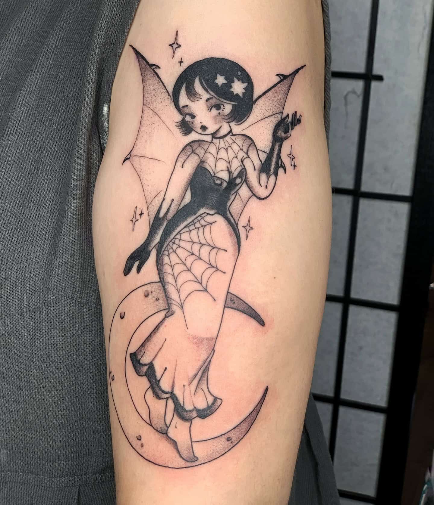 I love this tattoo! It features a delightful character with striking features and a playful pose, which embodies this unique mix of gothic and whimsical styles. The intricate details, like the sparkling star and the bat, add a fun twist that makes it a total standout.