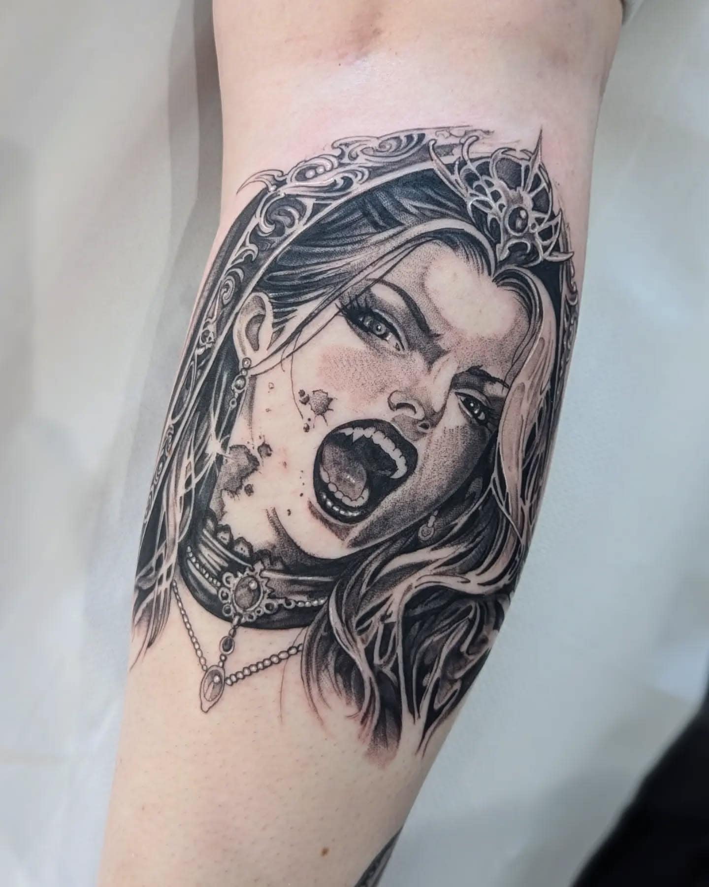 This tattoo shows a fierce vampire queen, and her expression is just filled with power and intensity. I love that the intricate details, like her crown and necklace, add a royal feel, making it such a striking piece of art.