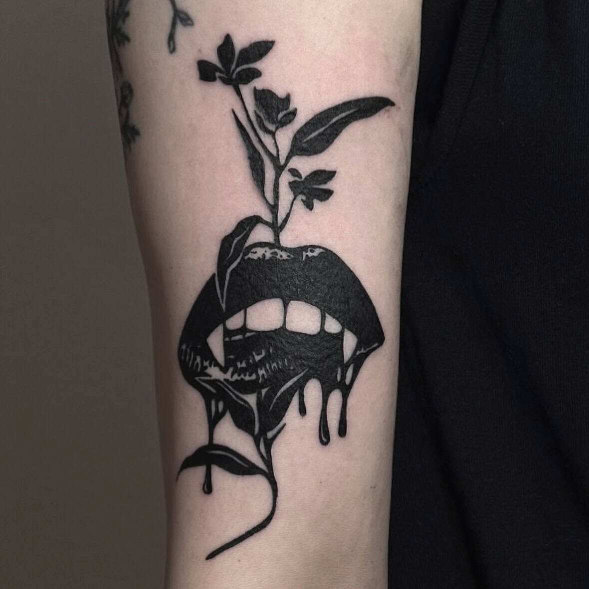 I love the striking blend in this tattoo, pairing dark lips with delicate flowers. It creates such a unique contrast that immediately catches your eye. This image is all about the balance between beauty and danger, a theme you see a lot in vampire lore.