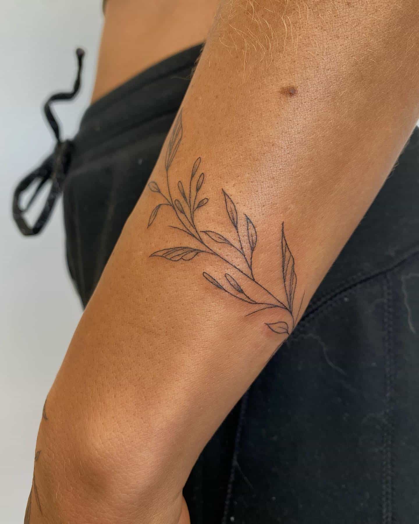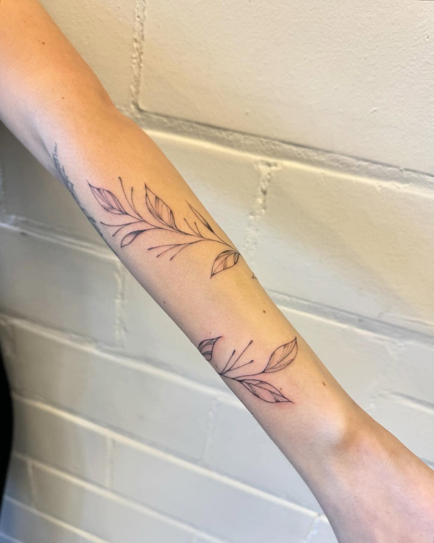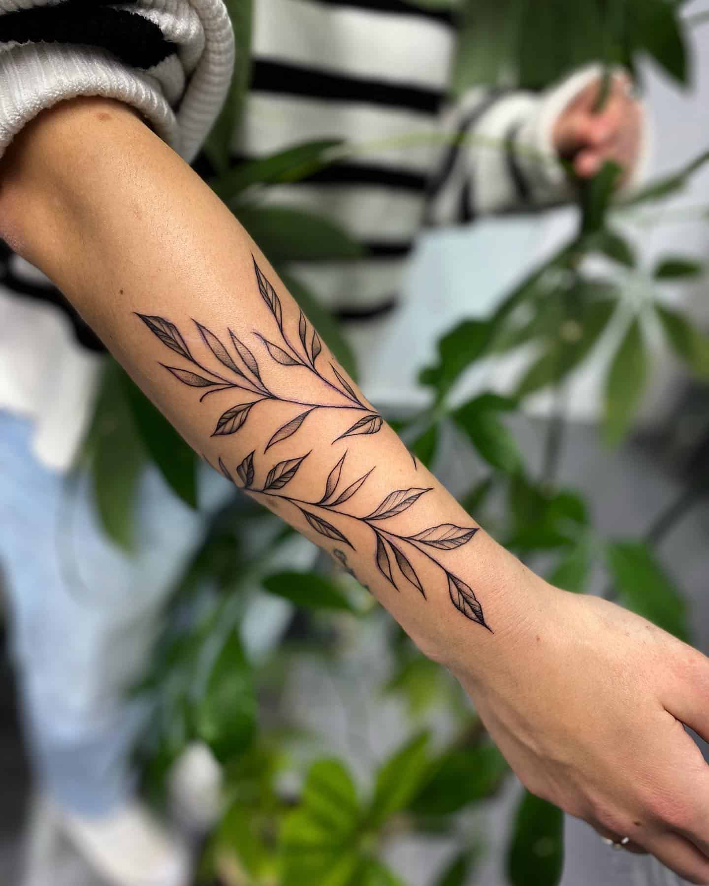 I’m all about this tattoo. The delicate leaves wrap around the arm so gracefully, creating a sense of movement and nature. The fine lines and simple design make it a perfect choice for those who appreciate beauty that is understated.