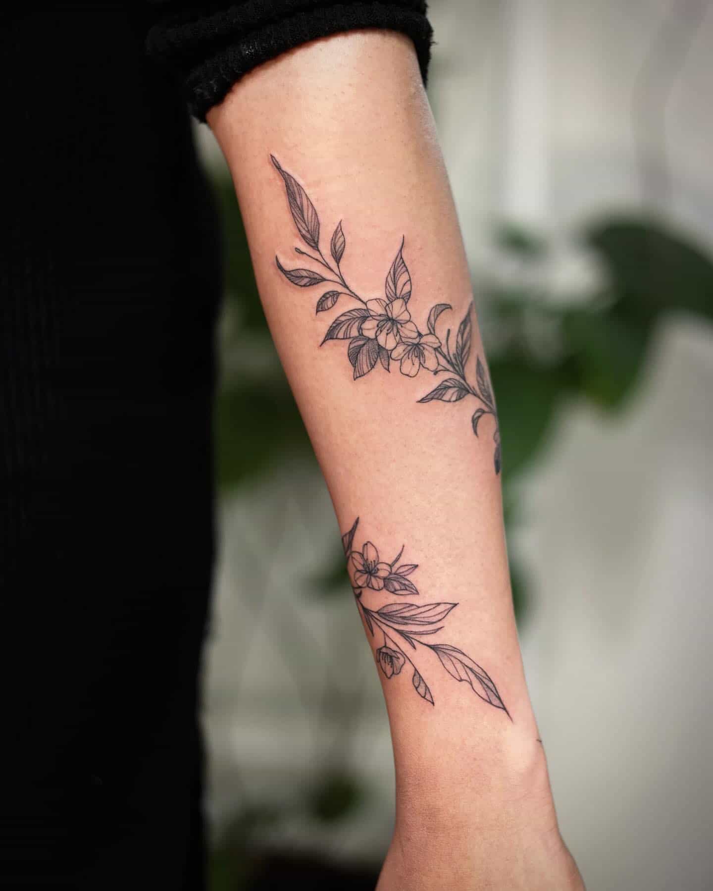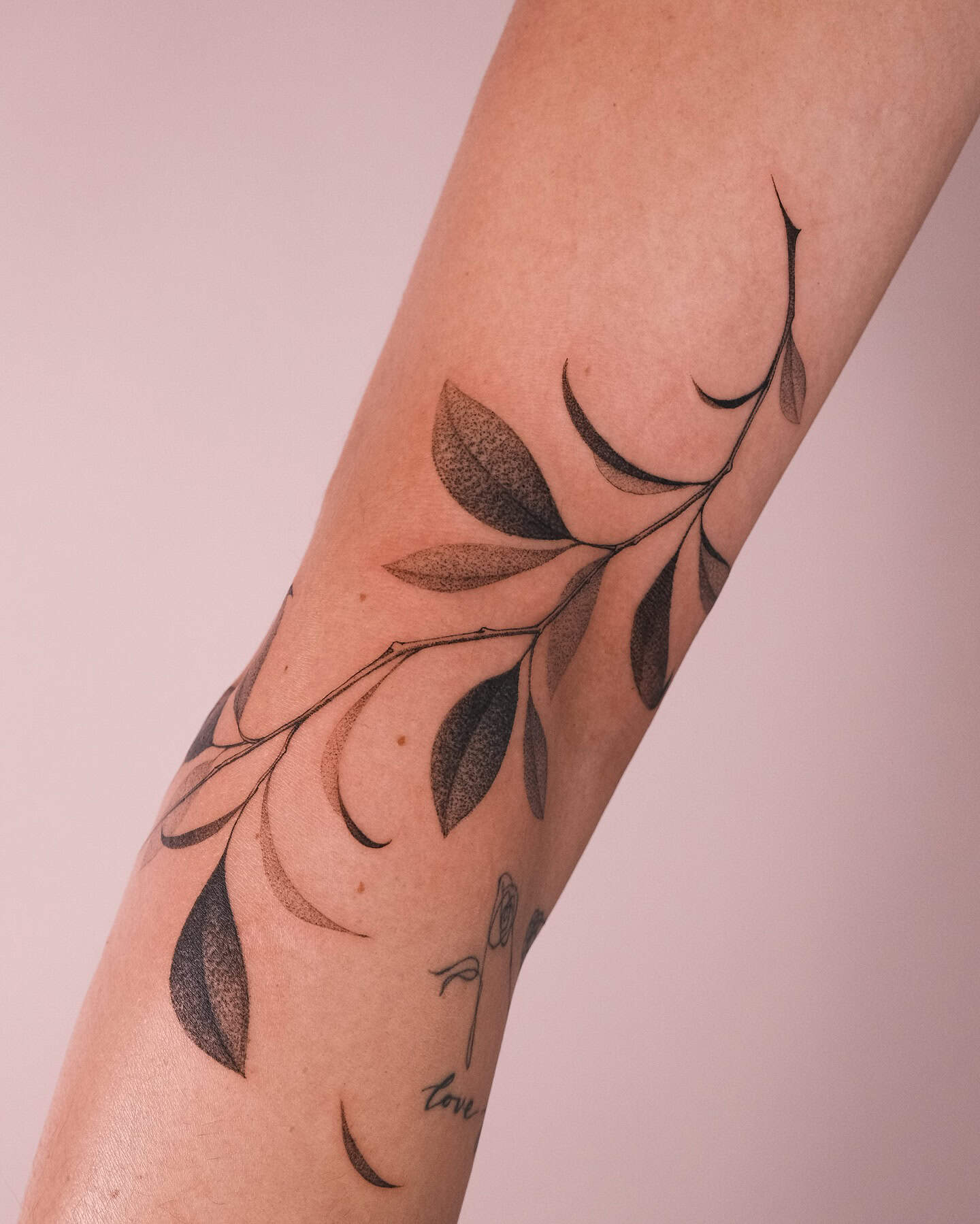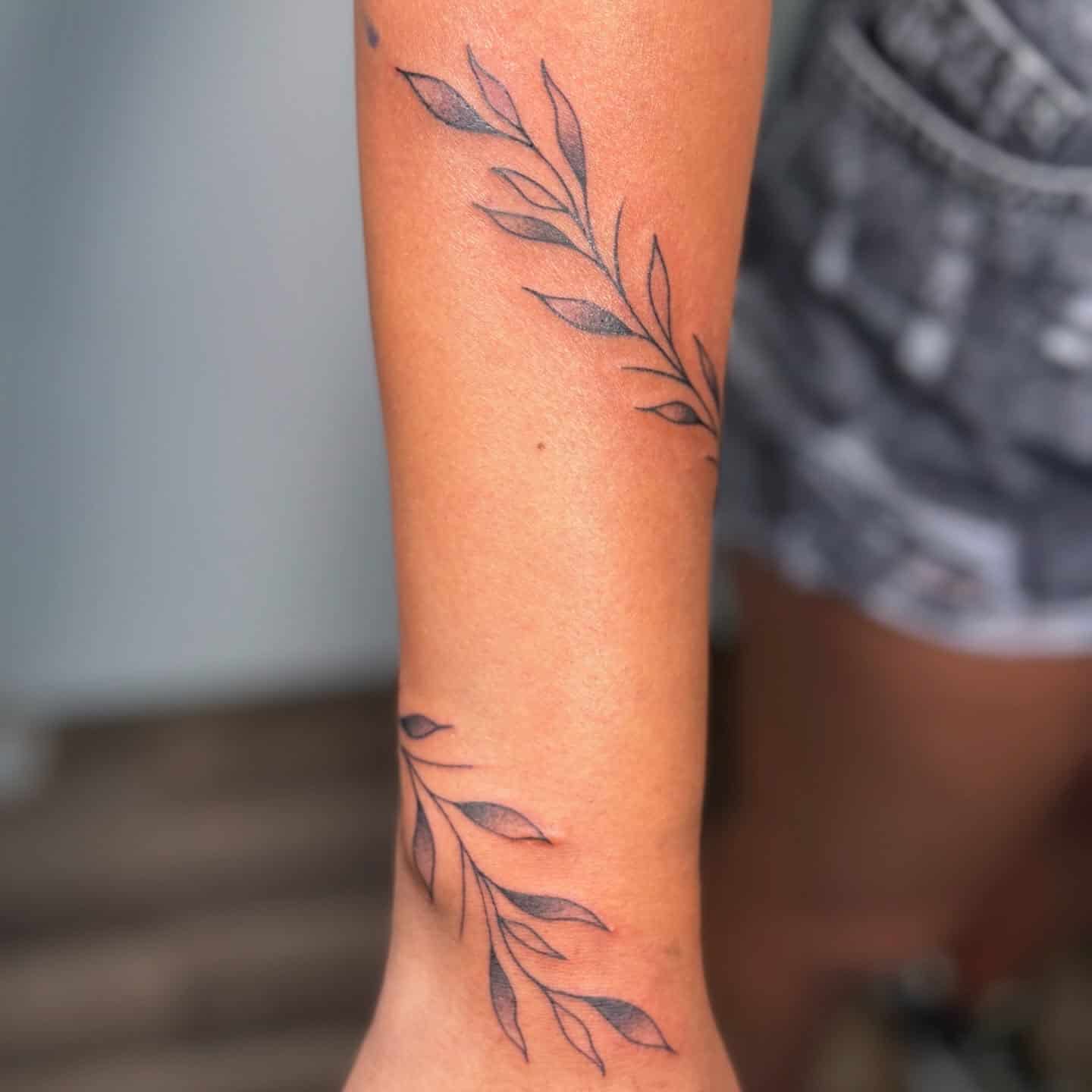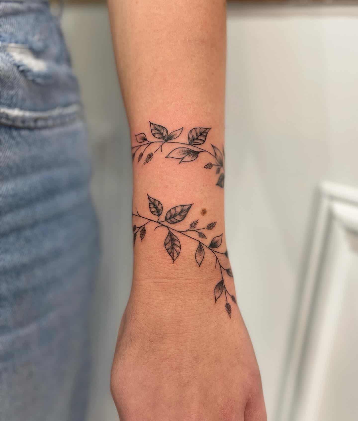 I’m all about this tattoo. The delicate leaves wrap around the arm so gracefully, creating a sense of movement and nature. The fine lines and simple design make it a perfect choice for those who appreciate beauty that is understated.