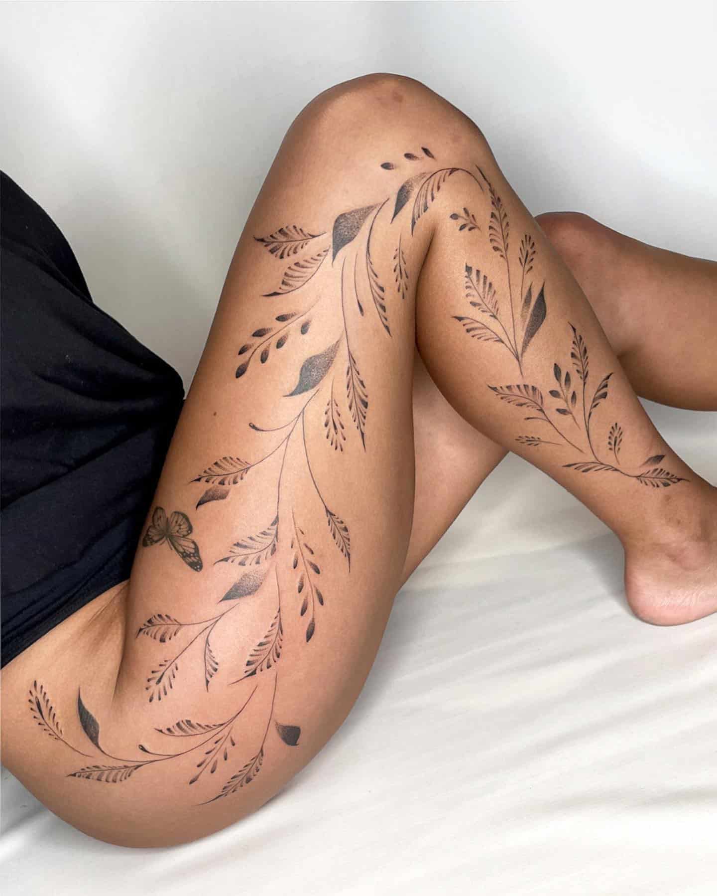 This stunning design is another one you’ll be screenshotting. It flows so gracefully along the leg and showcases intricate vine patterns that really mimic the beauty of nature. The delicate details, like the subtle butterfly, add a whimsical touch that makes this tattoo truly memorable.