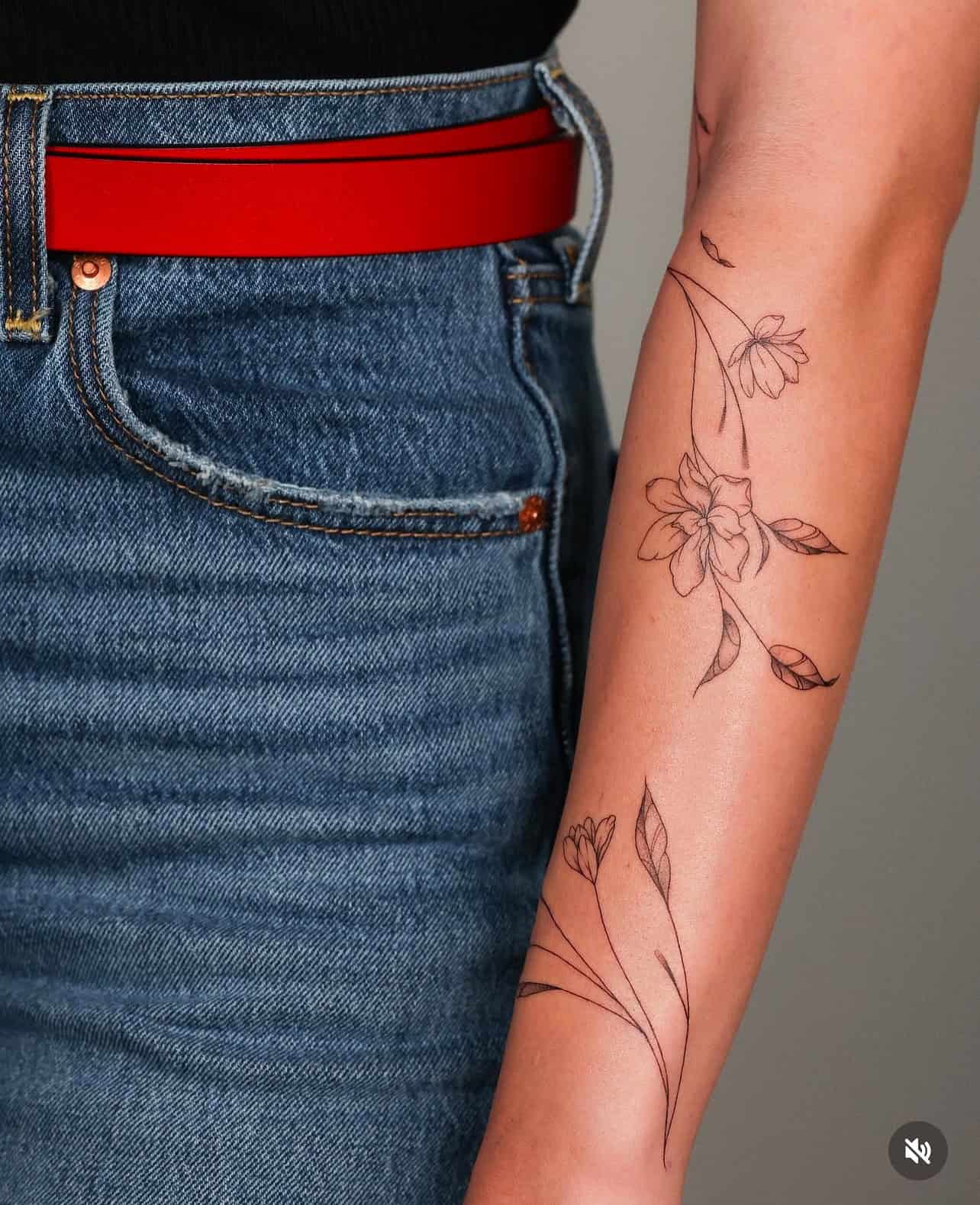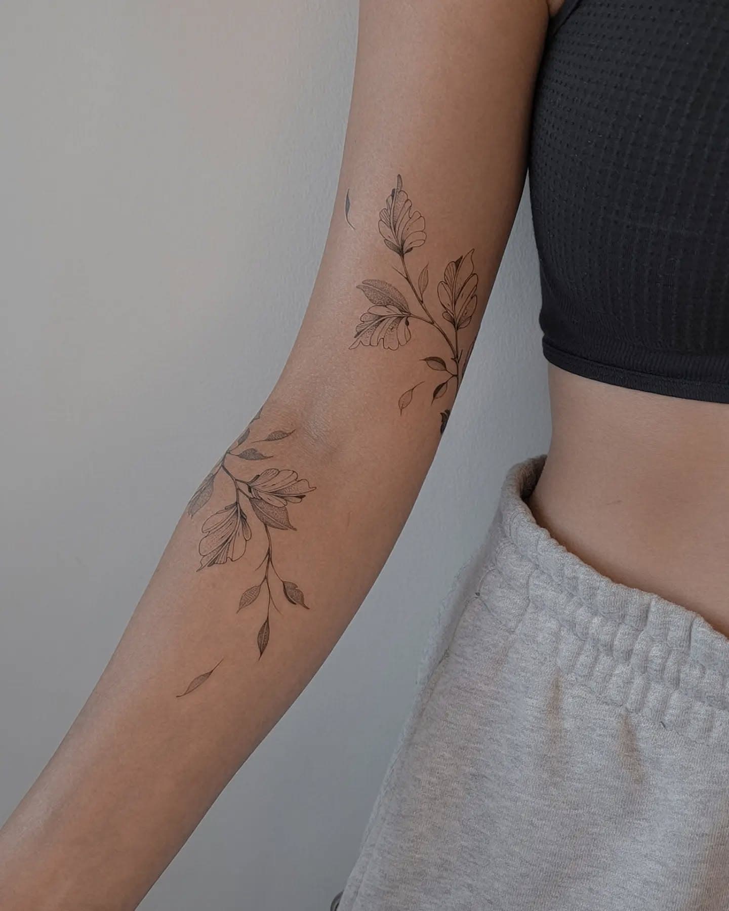 This enchanting tattoo is one for the books. It shows off delicate flowers intertwined with elegant vines, creating a beautiful flow across the arm. I am obsessed with how the intricate lines and soft details make it a total standout piece of art that tells a story of nature’s beauty.