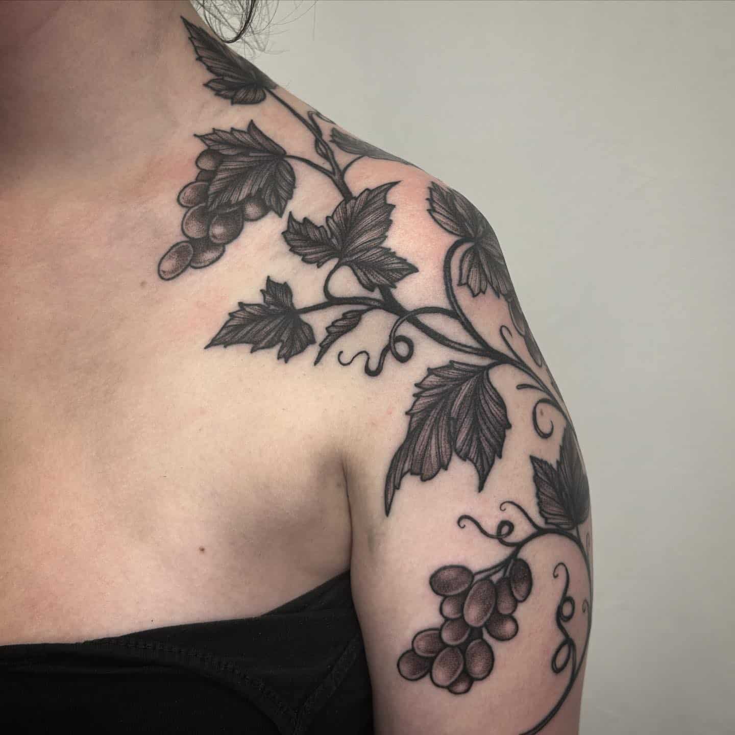 Okay, how incredible is this tattoo? It features intricate grapevines that wrap so elegantly around the shoulder, creating a beautiful flow. The detailed leaves and clusters of grapes add a touch of nature’s charm that makes it such a unique piece of body art.