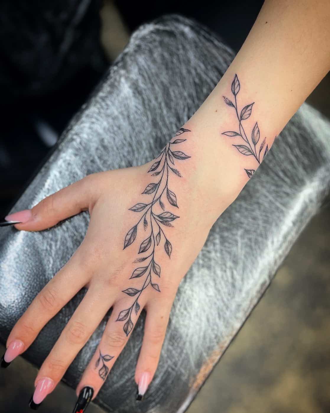 This beautiful tattoo is such a chic look. It features delicate vines curling around the wrist and hand, and it shows off an elegant mix of nature and artistry. I personally think the intricate detailing of each leaf adds a captivating touch, which makes it not just a tattoo but a total statement piece.
