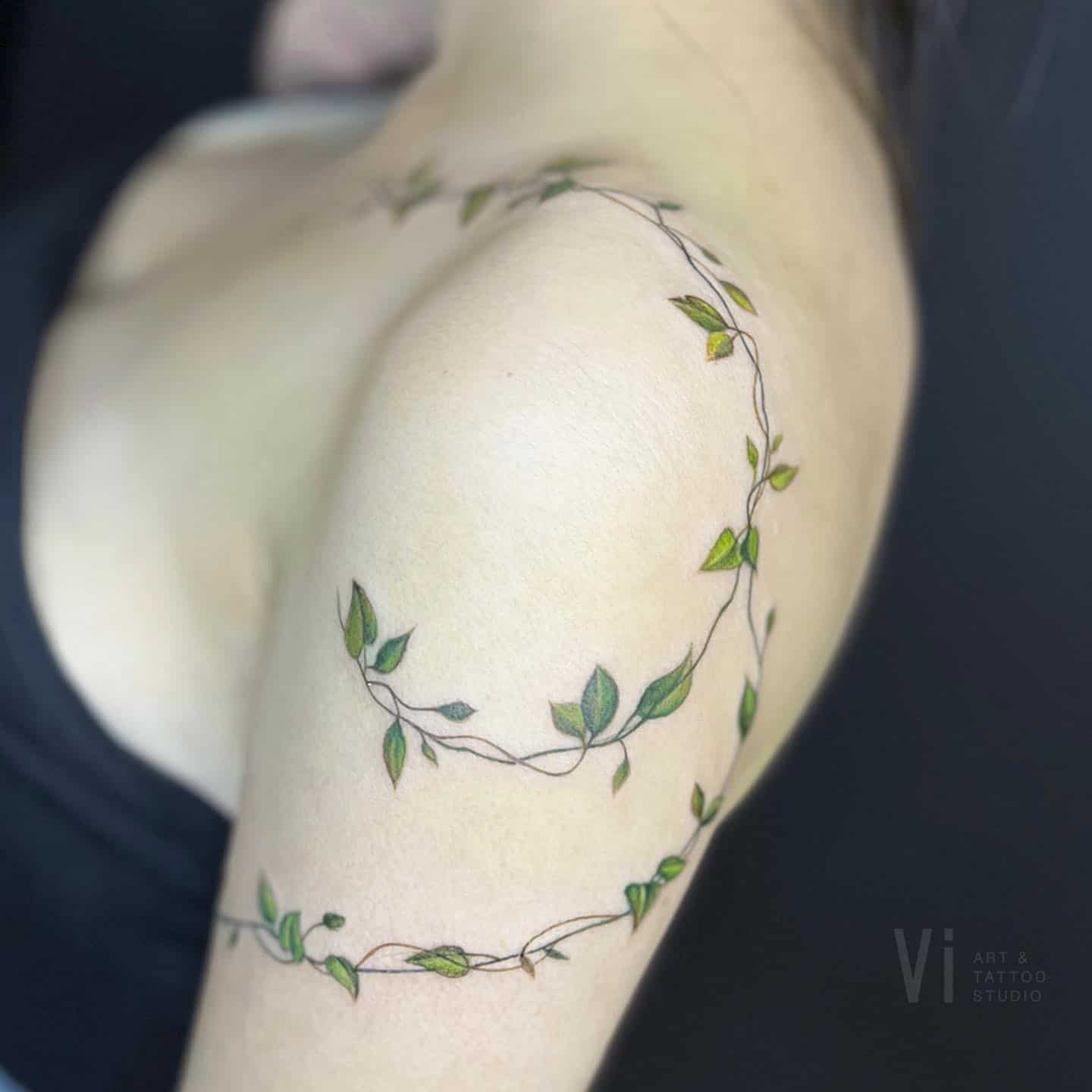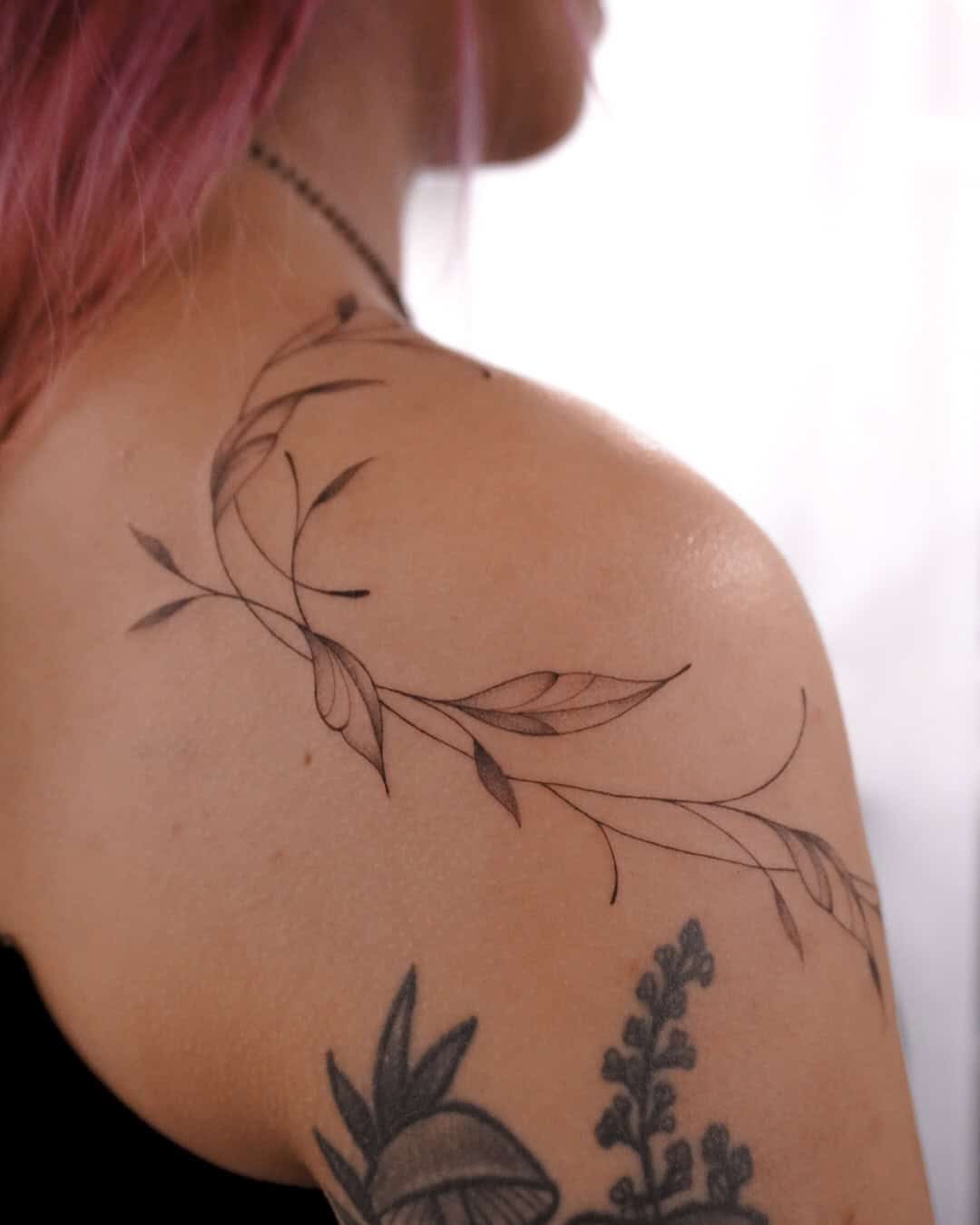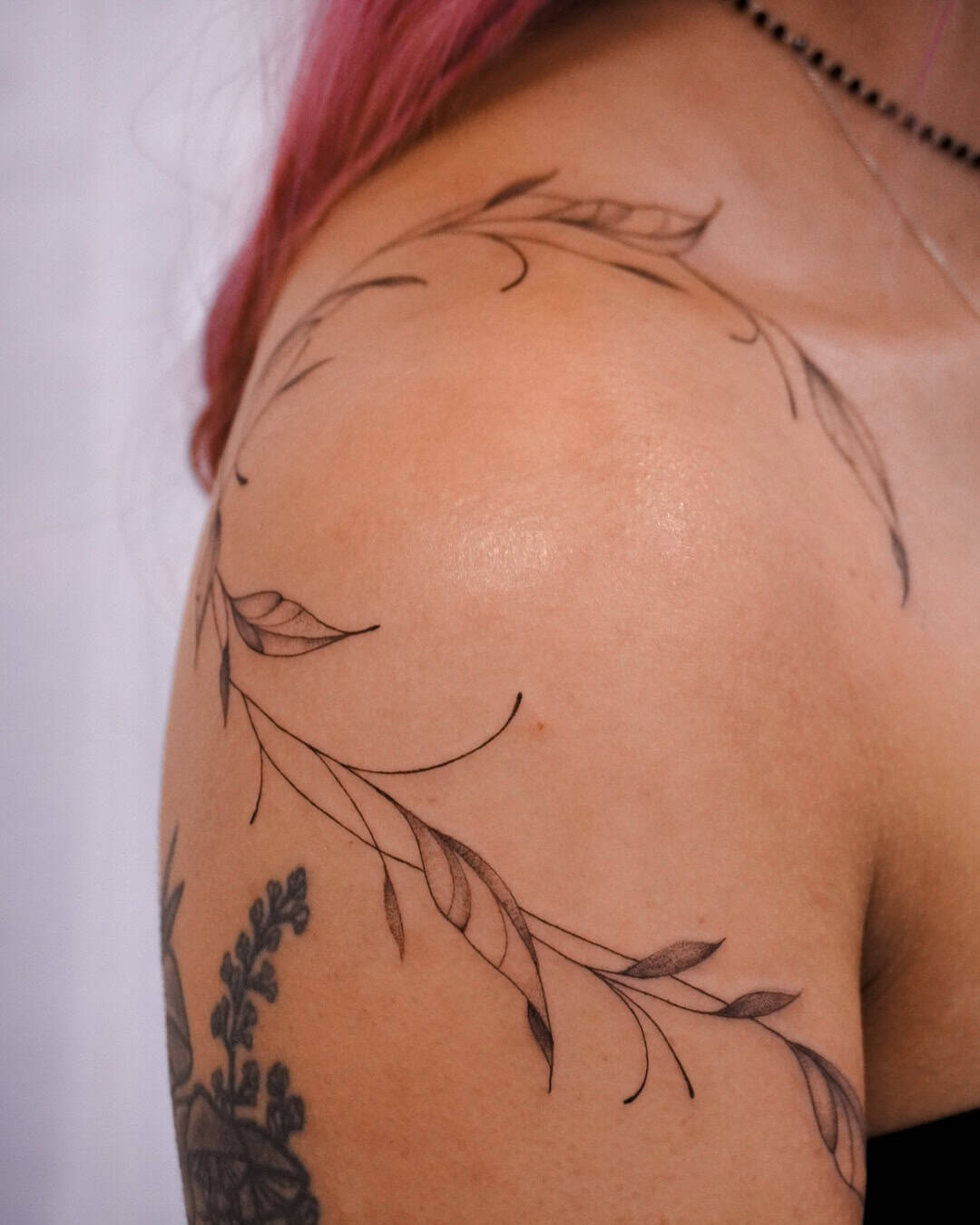 This beautiful vine tattoo is another one of my absolute faves. It wraps around the shoulder so gracefully and showcases delicate leaves that bring a little bit of nature to the skin. The soft, flowing lines create a look that is so serene and elegant.