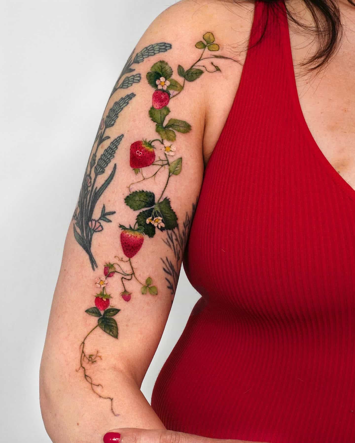 Okay, this tattoo is so cute I can’t handle it. The vibrant strawberries intertwined with delicate green vines create a look that is so lively and cheerful. I love how the mix of colors and intricate details brings the whole design to life. It’s such a unique piece of art.