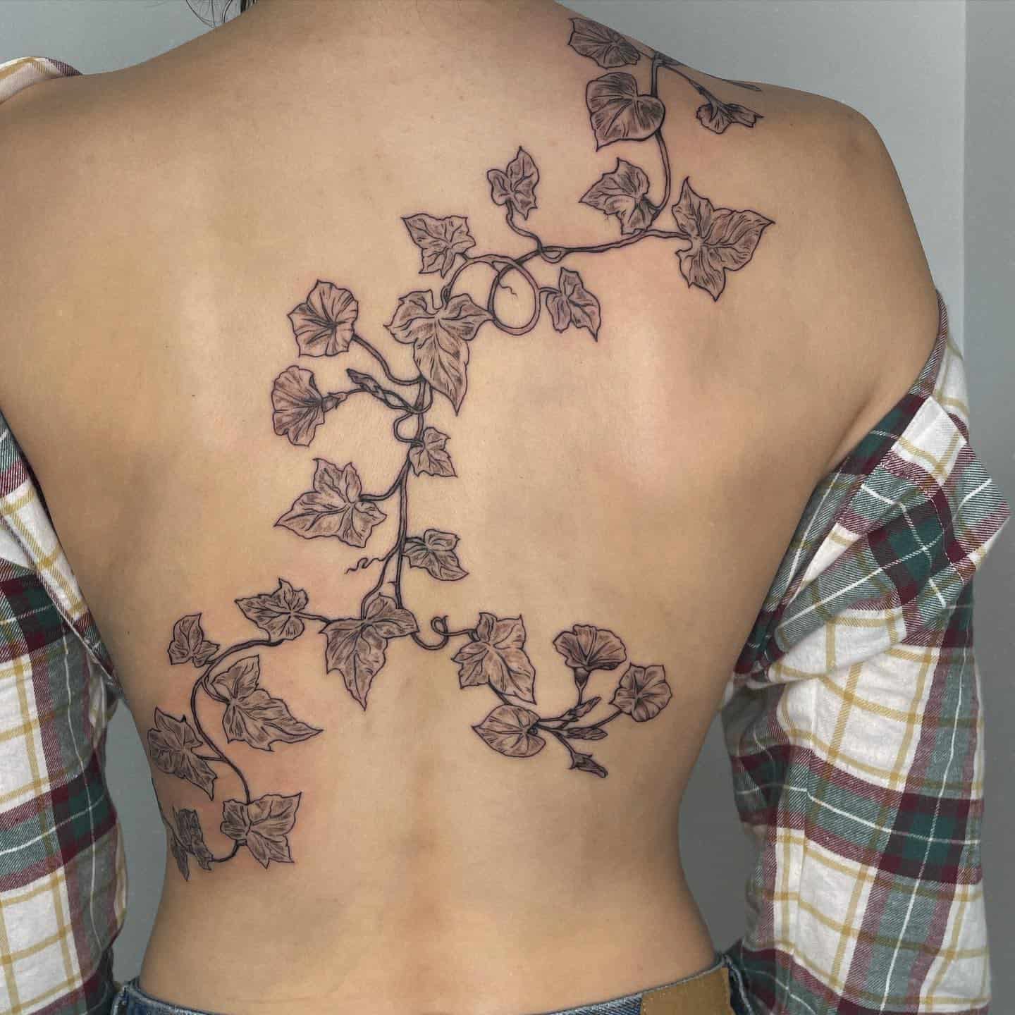 This tattoo is absolutely stunning. It features intricate ivy vines that elegantly weave their way across the back, showcasing both artistry and personal expression. I love that ivy can symbolize fidelity and resilience, making this design not just visually appealing, but also so meaningful.