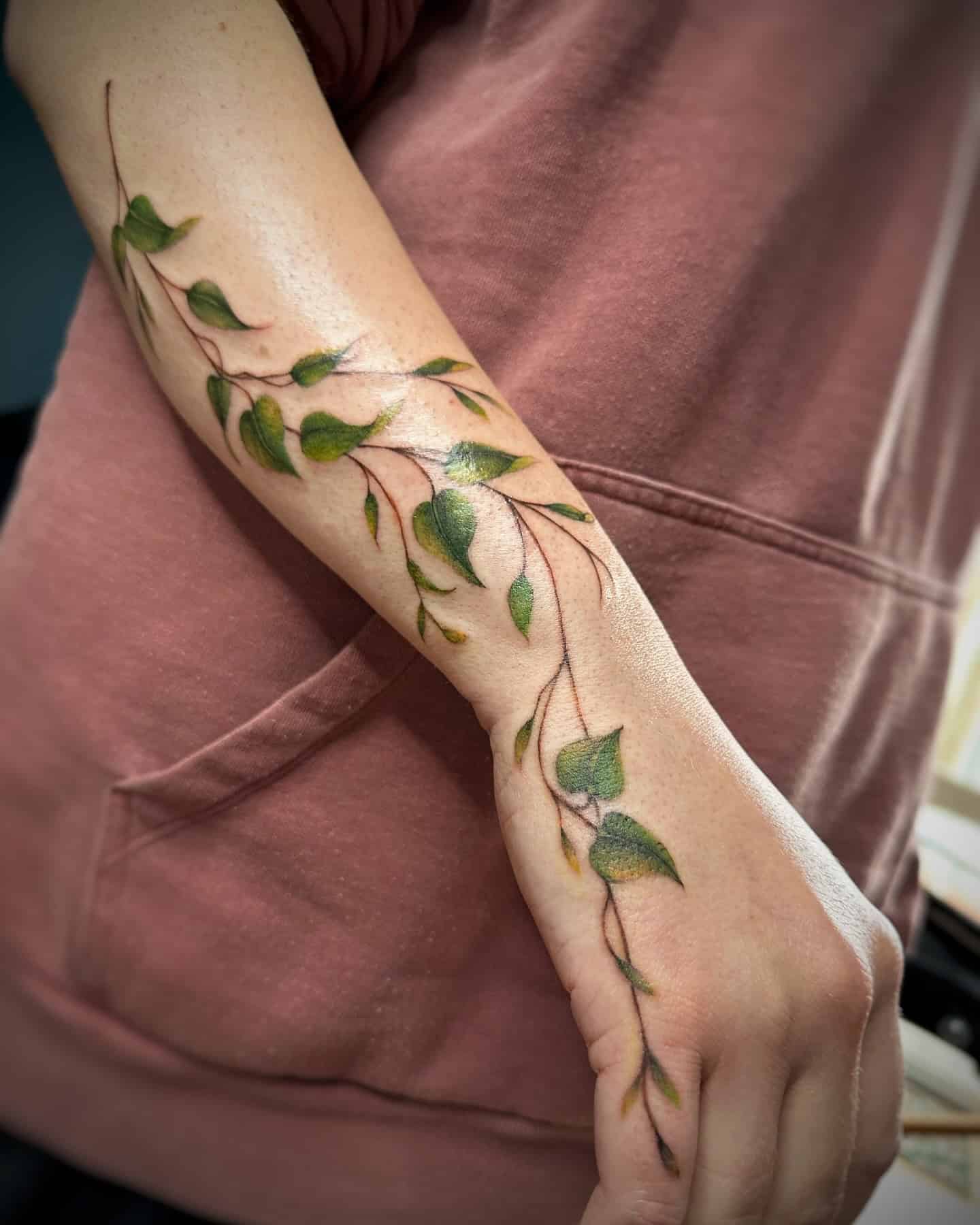 How lovely is this tattoo? It features delicate vines that weave so gracefully around the arm, adding a little touch of nature’s beauty. I am obsessed with how the vibrant green leaves pop against the skin.
