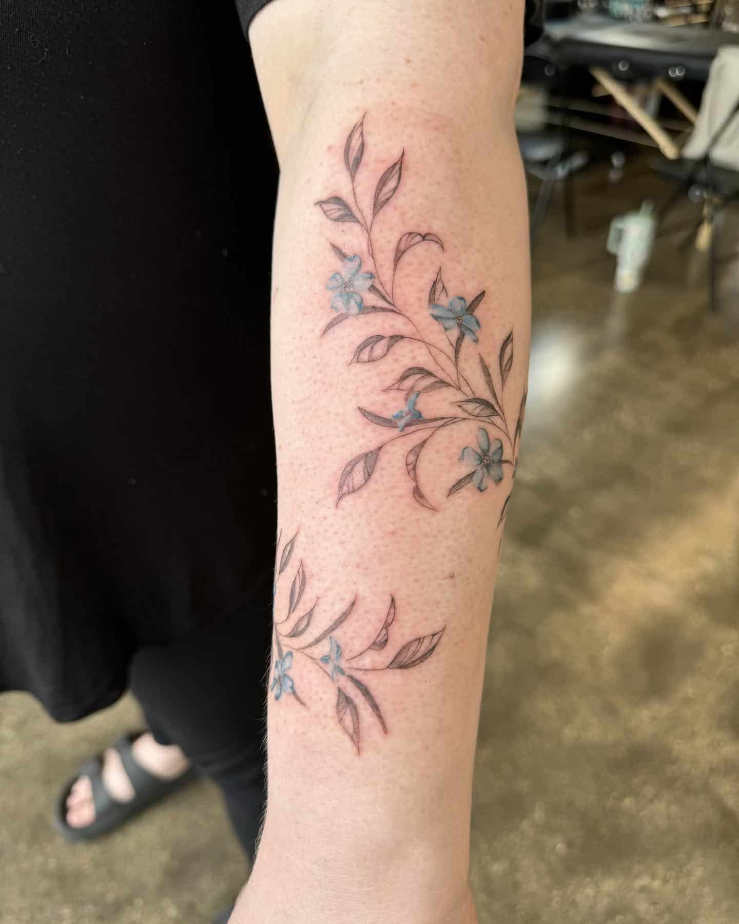 This tattoo is such a dream. I love that it stands out with its delicate blue flowers intertwined with graceful green leaves. The whole thing creates a look that is so soft and inviting. Every detail captures the beauty of nature perfectly.
