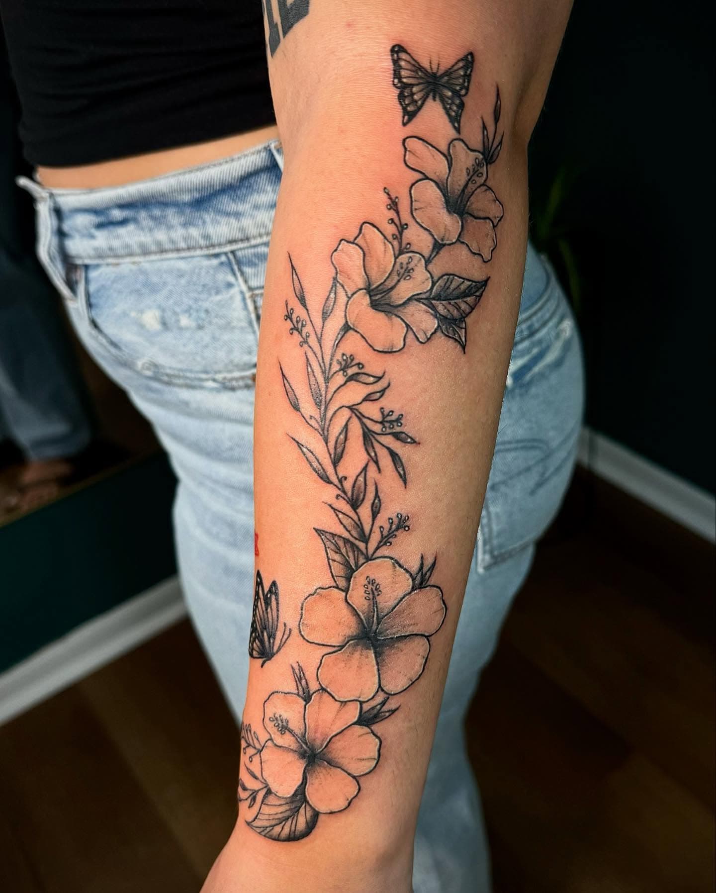 I can’t get enough of this stunning tattoo. The delicate flowers intertwined with graceful vines create a beautiful flow that really captures your attention. I am obsessed with the addition of a butterfly because it adds a touch of whimsy, symbolizing transformation and beauty.