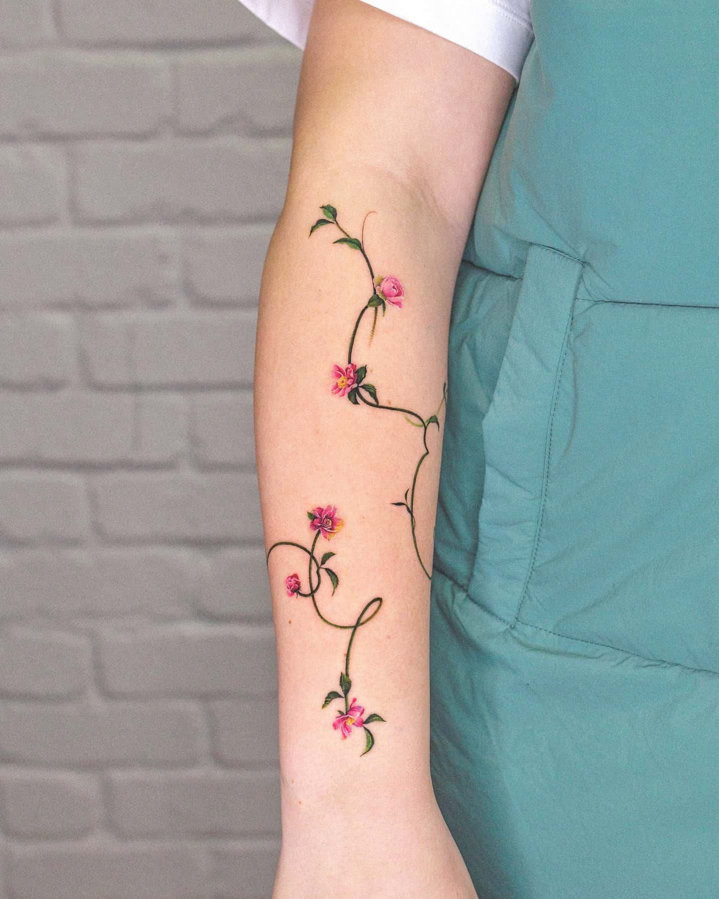 You guys are going to love this one. This image showcases a lovely tattoo with delicate pink flowers intertwined with green vines, which creates a look that is so soft and inviting. The gentle curves of the design flow so elegantly along the arm, giving it a natural, organic feel.